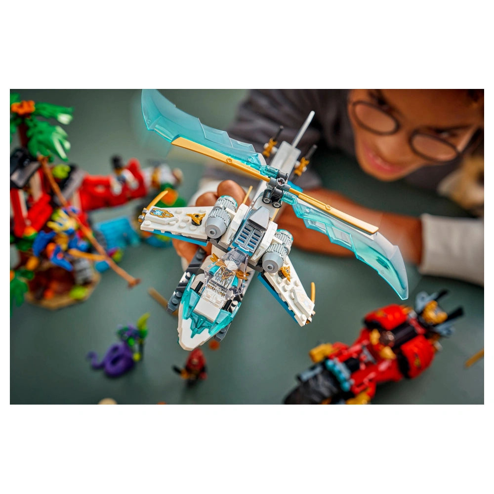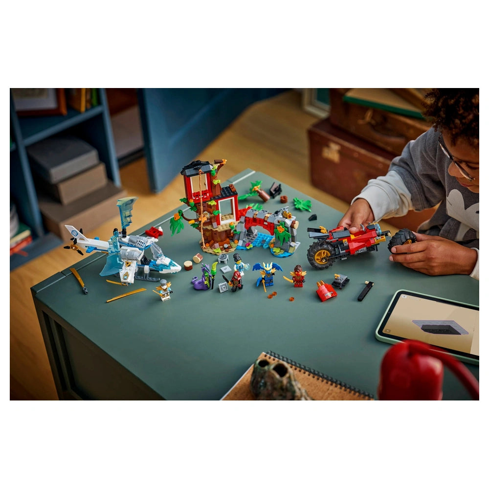LEGO - Ninjago Ninja Fahrzeug Baumhauskampf - Konstruktionsspielzeug Präsentieren Sie das LEGO Ninjago Ninja Fahrzeug Baumhauskampf (71857), ein aufregendes Konstruktionsspielset, das für Jungen und Mädchen ab 7 Jahren konzipiert ist. Dieses dynamische Spielset ermöglicht es jungen Baumeistern, in die actionreiche Welt von Ninjago einzutauchen, inspiriert von der spannenden vierten Staffel der NINJAGO® Dragons Rising TV-Show. Mit insgesamt 642 Teilen bietet dieses Set endlose Möglichkeiten für fantasievolles Spiel und kreatives Geschichtenerzählen und ist eine perfekte Ergänzung für jede LEGO-Sammlung. Das Herzstück dieses Sets ist das beeindruckende dreistöckige Baumhaus, das eine Vielzahl von fesselnden Elementen bietet. Kinder können die Werkstatt erkunden, im Teezimmer entspannen oder auf die Terrasse hinausgehen. Das Baumhaus ist mit interaktiven Funktionen ausgestattet, wie einem schwingenden Lianenseil, einer Falle, die einen kleinen Stein freisetzt, einer drehbaren Brücke und einem Noppenwerfer, sodass jede Spielsitzung mit Spannung und Abenteuer gefüllt ist. Diese mehrstöckige Struktur dient nicht nur als Schlachtfeld, sondern auch als Zentrum für Kreativität und Erkundung. Neben dem Baumhaus enthält das Set zwei aufregende Ninja-Fahrzeuge: ein Motorrad und einen Hubschrauber. Das Motorrad verfügt über bewegliche Räder, ein Sattel-Cockpit für eine Minifigur und zwei Noppenwerfer, die rasante Verfolgungsjagden und gewagte Fluchten ermöglichen. Der Hubschrauber hingegen hat ein öffnendes Cockpit und rotierende Rotorblätter, die perfekt für Luftmanöver und strategische Angriffe sind. Diese Fahrzeuge verbessern das Spielerlebnis und bieten den Kindern die Werkzeuge, die sie benötigen, um ihre Lieblingskampfszenen nachzustellen oder neue zu erfinden. Das LEGO Ninjago Ninja Fahrzeug Baumhauskampf Set kommt mit sechs Minifiguren, darunter die beliebten Charaktere Kai, Zane, Drachenform Jay und Euphrasia. Diese Figuren sind entscheidend für epische Kämpfe gegen den bösen Säuremonster und Loyalisten. Mit einer vielfältigen Besetzung von Helden und Bösewichten können Kinder aufregende Konfrontationen nachspielen und ihre eigenen Geschichten entwickeln, was Kreativität und Rollenspiel-Fähigkeiten fördert. Der Bau dieses Sets macht nicht nur Spaß, sondern ist auch lehrreich. Die LEGO® Builder App bietet ein intuitives Bauerlebnis, das es Kindern ermöglicht, hinein zu zoomen, Modelle in 3D zu drehen und ihren Fortschritt mit leicht verständlichen digitalen Anleitungen zu verfolgen. Dieser moderne Ansatz beim Bauen verbessert das Gesamterlebnis und macht es für junge Baumeister aller Fähigkeitsstufen zugänglich und angenehm. Das LEGO Ninjago Ninja Fahrzeug Baumhauskampf (71857) ist mehr als nur ein Spielzeug; es ist ein Tor zu einem Universum voller Abenteuer und Kreativität. Ob als Geschenk zum Geburtstag, zu Feiertagen oder einfach nur so, dieses Set wird jedes Kind mit einer Leidenschaft für Fantasie und kreatives Spiel begeistern. Verpassen Sie nicht die Gelegenheit, die Kreativität Ihres Kindes zu inspirieren – bestellen Sie noch heute das LEGO Ninjago Ninja Fahrzeug Baumhauskampf und beobachten Sie, wie es in seine eigenen epischen Ninja-Abenteuer eintaucht!