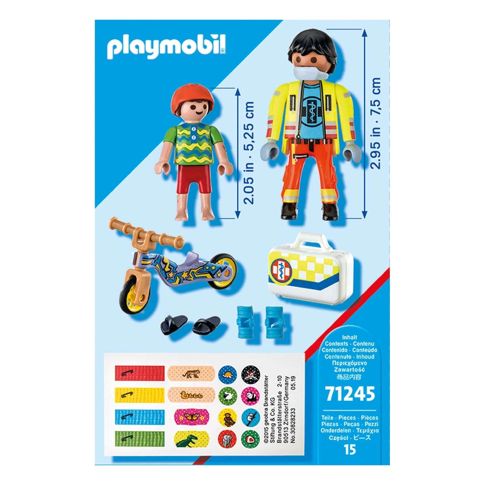 Playmobil City Life Krankenschwester mit Patient - 71245 Präsentieren Sie die Playmobil City Life Krankenschwester mit Patient - 71245, ein bezauberndes und ansprechendes Spielset, das dazu entworfen wurde, fantasievolles Spielen zu inspirieren und Kindern die Bedeutung von Pflege und Mitgefühl näherzubringen. Dieses Set enthält einen engagierten Sanitäter, der stets bereitsteht, um Erste Hilfe zu leisten, und so sicherstellt, dass die Kleinen auf spielerische und interaktive Weise über Gesundheit und Sicherheit lernen. Mit seinen lebendigen Farben und detaillierten Zubehörteilen ist dieses Spielset perfekt für Kinder ab vier Jahren und somit ein ideales Geschenk für angehende Pflegekräfte und Abenteurer. Das Playmobil City Life Krankenschwester mit Patient Set umfasst zwei hochdetaillierte Figuren: einen fürsorglichen Sanitäter und einen verletzten Jungen, die beide bereit sind, sich auf eine Reise der Heilung und Genesung zu begeben. Der Sanitäter ist mit einem umfassenden Erste-Hilfe-Set ausgestattet, das Schienen und eine Vielzahl von Verbänden enthält, sodass Kinder verschiedene Szenarien nachspielen können, in denen sie ihre Pflegefähigkeiten üben können. Diese praktische Erfahrung fördert nicht nur die Kreativität, sondern auch das Einfühlungsvermögen, während die Kinder lernen, sich um andere zu kümmern. Ein herausragendes Merkmal dieses Sets ist die innovative Verwendung von wärmeempfindlicher Farbe am Arm und Bein des Kindes, die Verletzungen simuliert, die mit den enthaltenen Pflasteretiketten behandelt werden können. Wenn man darüber reibt, verschwinden die "Verletzungen", um wieder aufzutauchen, sobald sie abgekühlt sind, was ein fesselndes und lehrreiches Erlebnis bietet, das den Kindern den Heilungsprozess näherbringt. Dieses interaktive Element verleiht dem Spiel eine realistische Note und ermutigt die Kinder, kritisch darüber nachzudenken, wie sie Verletzungen behandeln und sich um ihre Freunde kümmern können. Darüber hinaus enthält das Set einen Roller, einen Helm und Hausschuhe, die alle zur fantasievollen Spielerfahrung beitragen. Kinder können ihre eigenen Geschichten und Szenarien kreieren, sei es eine schnelle Fahrt ins Krankenhaus oder ein lustiger Tag im Park. Die abnehmbare Gesichtsmaske, der Helm und die Hausschuhe ermöglichen eine weitere Anpassung und Rollenspiel, sodass jede Spielsitzung einzigartig und aufregend ist. Die Playmobil City Life Reihe ist bekannt für ihre modernen Fahrzeuge und realistischen Charaktere, was sie bei Kindern und Eltern gleichermaßen beliebt macht. Dieses spezielle Set unterhält nicht nur, sondern dient auch als wertvolles Bildungswerkzeug, das Kindern hilft, wichtige soziale Fähigkeiten und ein Verständnis für Gesundheit und Sicherheit zu entwickeln. Durch das Spielen von Rollenspielen können Kinder ihre Kreativität erkunden und gleichzeitig die Verantwortung lernen, die mit der Pflege anderer einhergeht. Verpassen Sie nicht die Gelegenheit, die Spielzeit Ihres Kindes mit der Playmobil City Life Krankenschwester mit Patient - 71245 zu bereichern. Dieses Spielset ist mehr als nur ein Spielzeug; es ist ein Tor zu Lernen und Entdeckung. Bestellen Sie jetzt und beobachten Sie, wie Ihr Kind in eine Welt voller Abenteuer, Mitgefühl und Kreativität eintaucht!