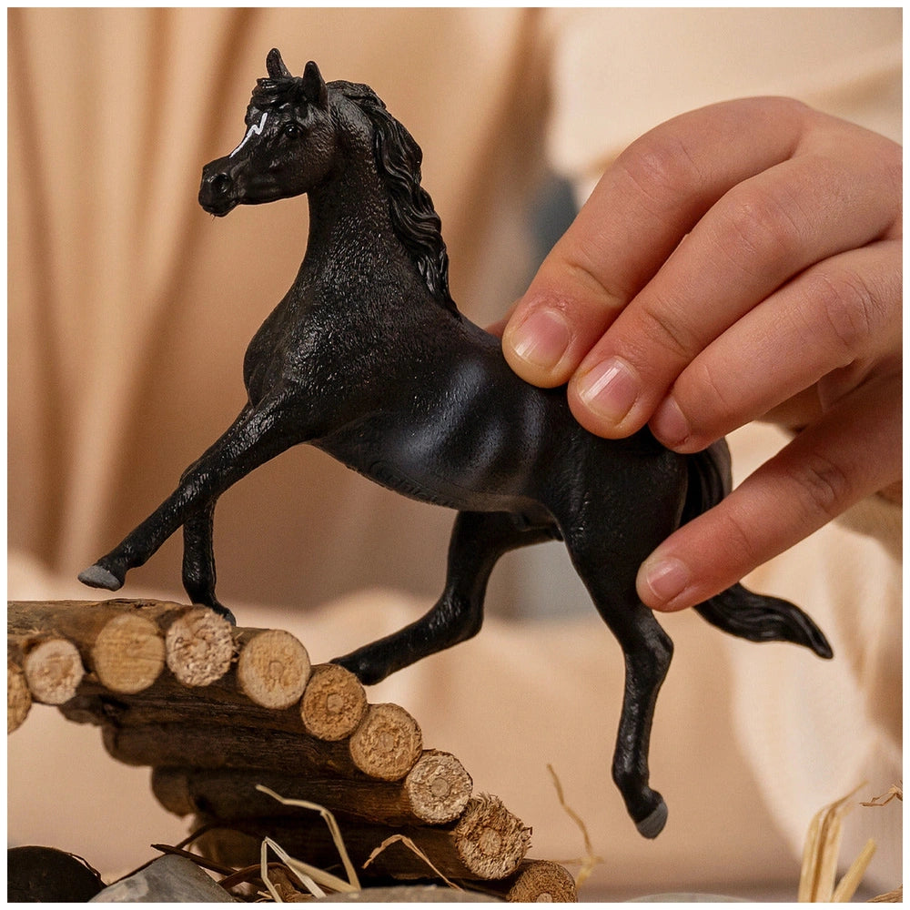 Introducing the Schleich - Horse Club - Arabian Stallion - Action & Toy Figures - 13981, a stunning addition to any toy collection that captures the essence of one of the most beloved horse breeds in the world. This exquisite Arabian Stallion is designed with meticulous attention to detail, showcasing a sleek black coat that glistens like the night sky. The stallion's elegant appearance is further enhanced by a few delicate light strands in his tail and a charming white stripe on his forehead, making him a standout figure in the Schleich lineup.