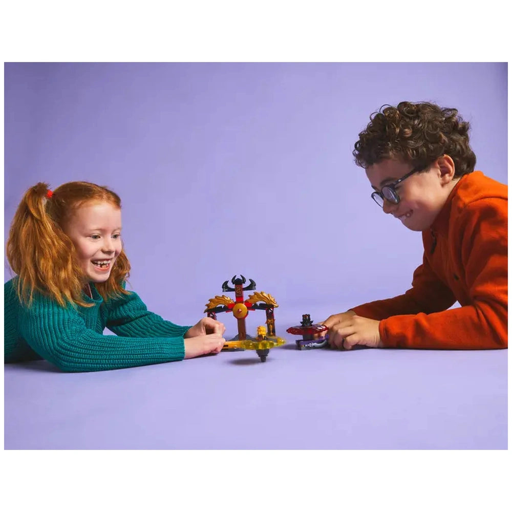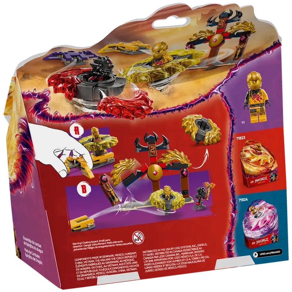 Lego - Ninjago - Dragon Spinjitzu Battle Pack - Konstruktionsspielzeug Präsentieren Sie das LEGO Ninjago Dragon Spinjitzu Battle Pack (71826), ein aufregendes Konstruktionsset, das für junge Abenteurer ab 6 Jahren konzipiert ist. Dieses actionreiche Spielset ermöglicht es Kindern, in die fesselnde Welt von NINJAGO einzutauchen, die speziell von den spannenden Ereignissen der dritten Staffel der NINJAGO Dragons Rising TV-Show inspiriert ist. Mit seinen ansprechenden Funktionen und dynamischem Gameplay verspricht dieses Set, die Fantasie von Jungen und Mädchen gleichermaßen zu entfachen und ist eine perfekte Ergänzung für jede LEGO-Sammlung. Das Dragon Spinjitzu Battle Pack enthält alles, was für epische Kämpfe zwischen dem heldenhaften Ninja Arin und dem niederträchtigen Ras benötigt wird. Das Set umfasst einen detaillierten Kampfarenatempel, in dem Kinder intensive Konfrontationen inszenieren können. Die beiden enthaltenen Minifiguren, Arin und Ras, sind mit Schwertzubehör ausgestattet, was authentische Rollenspiel-Szenarien ermöglicht. Kinder können die Dragon Spinjitzu Spinner in ihre Launcher einsetzen und sie ins Geschehen katapultieren, wodurch ein Wirbelwind der Aufregung entsteht, während sie darum wetteifern, wessen Spinner die Oberhand behält. Eine der herausragenden Eigenschaften dieses Sets ist der zusammenklappbare Kampfarenatempel. Während die Kinder an den Drehkämpfen teilnehmen, können sie darauf abzielen, den Tempel zu treffen und zum Einsturz zu bringen, um spezielle goldene Elemente zu verdienen, mit denen sie ihre Spinner aufrüsten können. Dieses interaktive Element verbessert nicht nur das Spielerlebnis, sondern fördert auch strategisches Denken und feinmotorische Fähigkeiten, während die Kinder lernen, ihre Spinner effektiv zu zielen und zu starten. Der Nervenkitzel des Sieges ist spürbar, während sie ihre Spinner in die Höhe fliegen sehen und die Tempel ihrer Gegner fallen. Das LEGO Ninjago Dragon Spinjitzu Battle Pack ist nicht nur ein eigenständiges Set; es öffnet die Tür zu einem größeren Universum von NINJAGO-Spielzeugen. Mit zusätzlichen Sets, darunter Mechs, Drachen und Fahrzeuge, können Kinder ihre Abenteuer erweitern und noch elaboriertere Geschichten kreieren. Die LEGO Builder App bereichert das Bauerlebnis zusätzlich, indem sie Schritt-für-Schritt-Anleitungen bietet, die das Zusammenbauen des Sets intuitiv und angenehm für Kinder und Eltern machen. Dieses Konstruktionsset ist ein ideales Geschenk für jedes Kind mit einer Leidenschaft für fantasievolles Spielen und Abenteuer. Die Kombination aus Bauen, Kämpfen und Rollenspiel macht es zu einem vielseitigen Spielzeug, das sowohl alleine als auch mit Freunden genossen werden kann. Das Dragon Spinjitzu Battle Pack fördert Kreativität und Zusammenarbeit und ermöglicht es den Kindern, soziale Fähigkeiten zu entwickeln, während sie sich in aufregende Ninja-Action stürzen. Verpassen Sie nicht die Gelegenheit, das LEGO Ninjago Dragon Spinjitzu Battle Pack noch heute nach Hause zu bringen! Dieses aufregende Spielset ist perfekt für Geburtstage, Feiertage oder einfach so. Rüsten Sie Ihren jungen Ninja mit den Werkzeugen für Abenteuer aus und beobachten Sie, wie er in eine Welt voller Kreativität und Spaß eintaucht. Bestellen Sie jetzt und lassen Sie die Kämpfe beginnen!