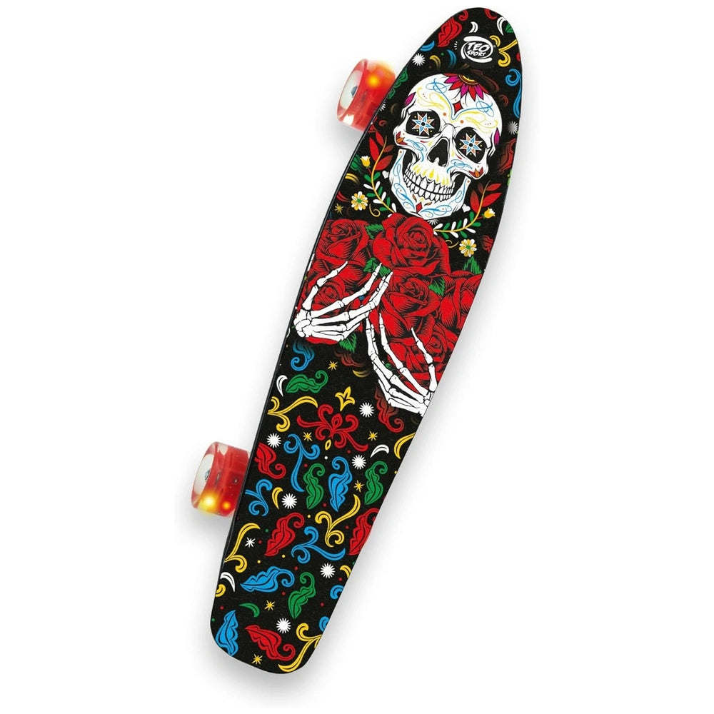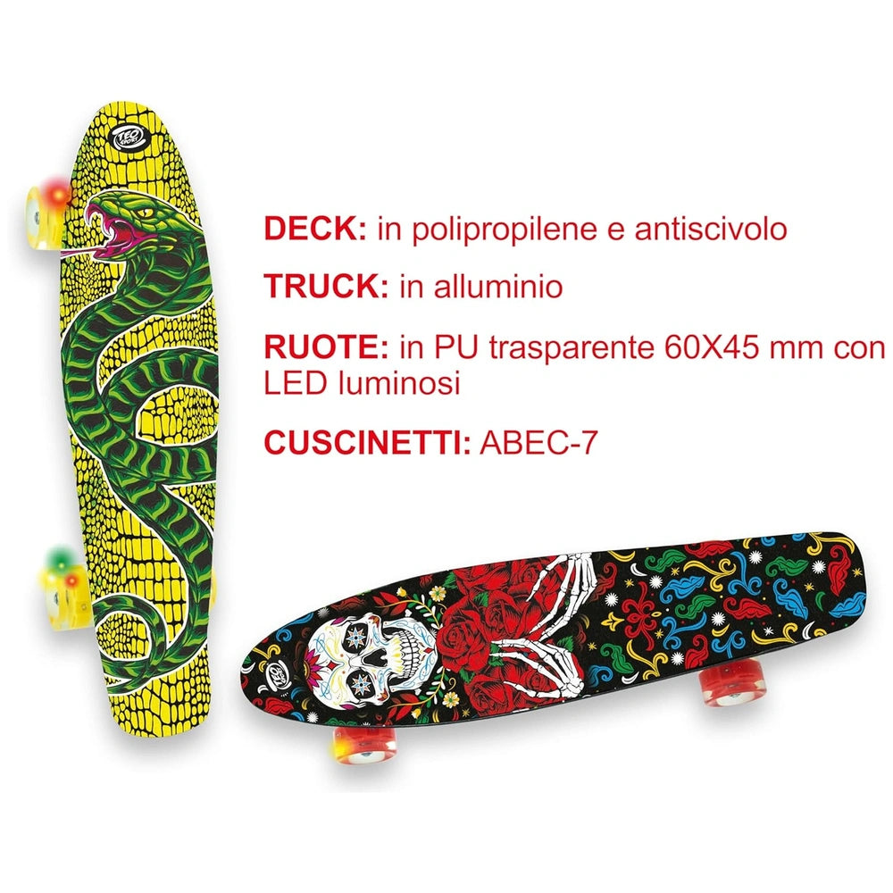 Introducing the Teo Sport LED Light-Up Mini Cruiser Skateboard, a vibrant and dynamic choice for both beginners and seasoned riders. This compact 56cm (22-inch) penny board is designed to make your outdoor adventures not only fun but also stylish. With its eye-catching graphics featuring a Green Snake, Tribal Lion, Graffiti Arrow, and Skull and Roses, this skateboard is sure to turn heads as you glide through the streets. The combination of portability and striking design makes it an essential addition to your outdoor play equipment.