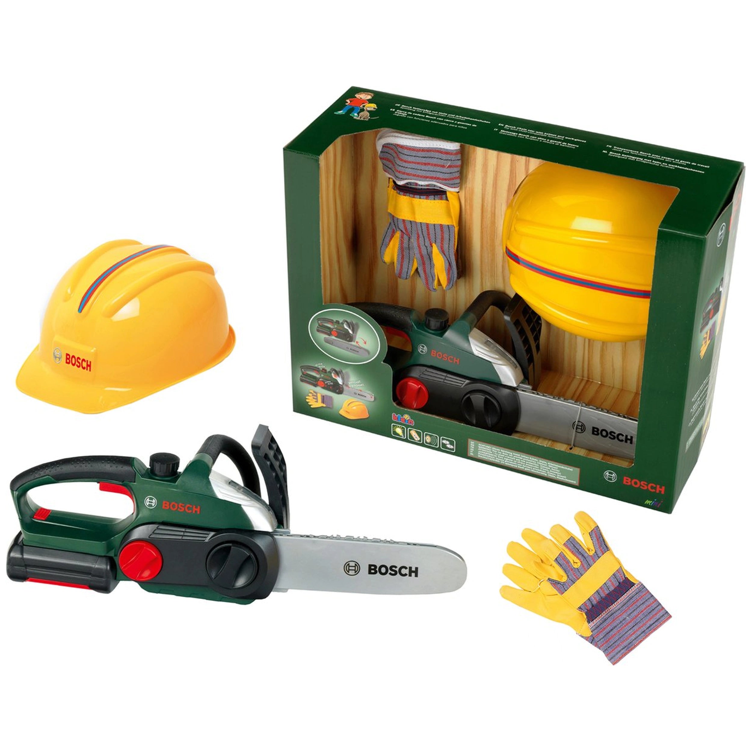 A toy chainsaw set consisting of a green and black chainsaw, a yellow helmet, and a pair of striped gloves, all branded with the name 'Bosch'.
