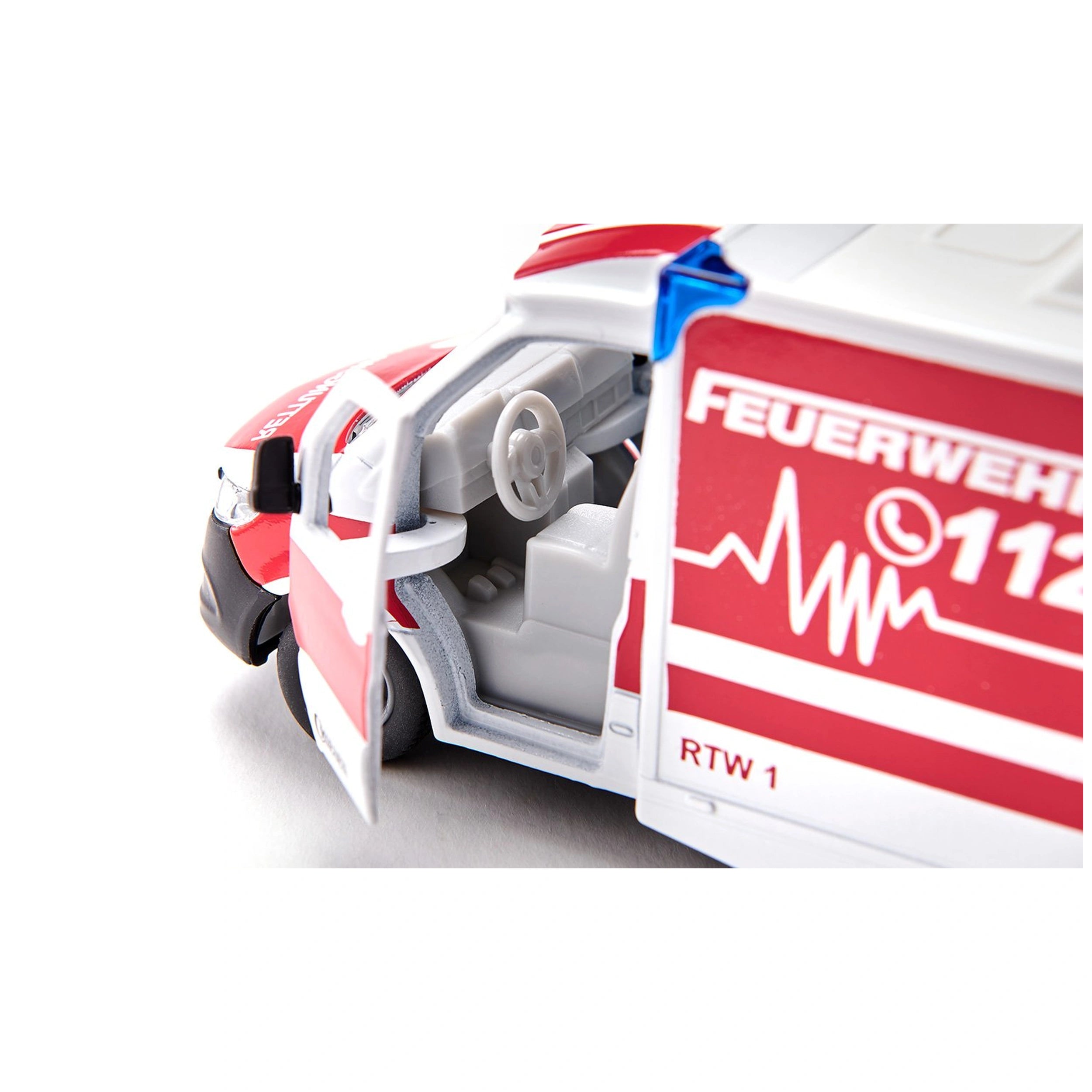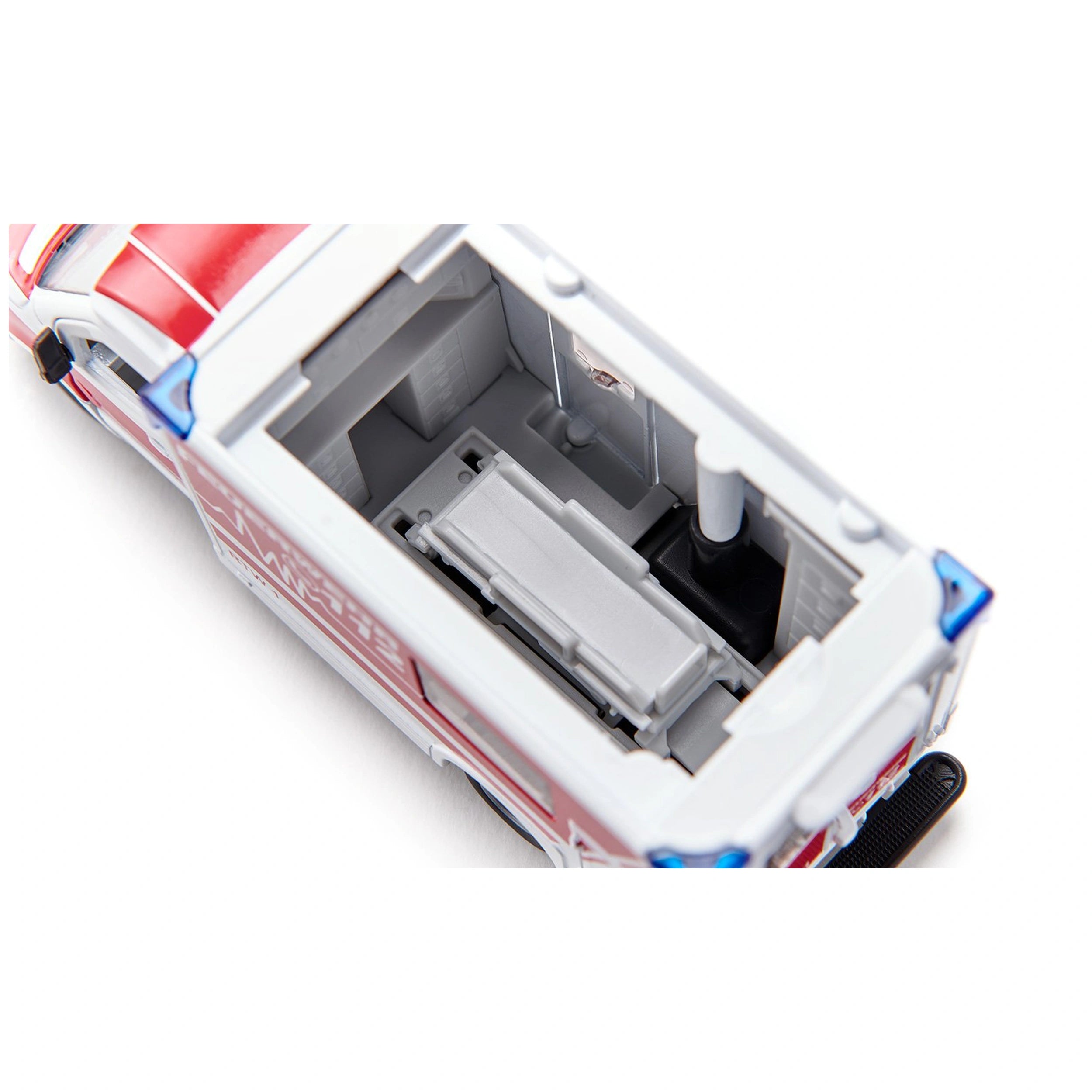 Inside the Mercedes-Benz Sprinter Miesen Type C, the emergency doctor is ready to provide critical care. The model includes essential accessories such as a stretcher and a spineboard, which are vital for transporting casualties. These elements not only enhance the realism of the play experience but also serve as educational tools, teaching children about the importance of first aid and emergency response. The side door of the Miesen superstructure and the removable roof offer a glimpse into the four-wheeled intensive care unit, making it easy for kids to visualize the care process.