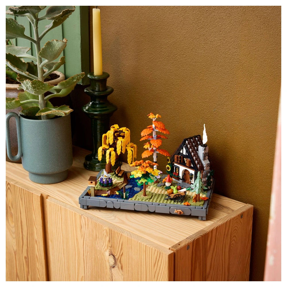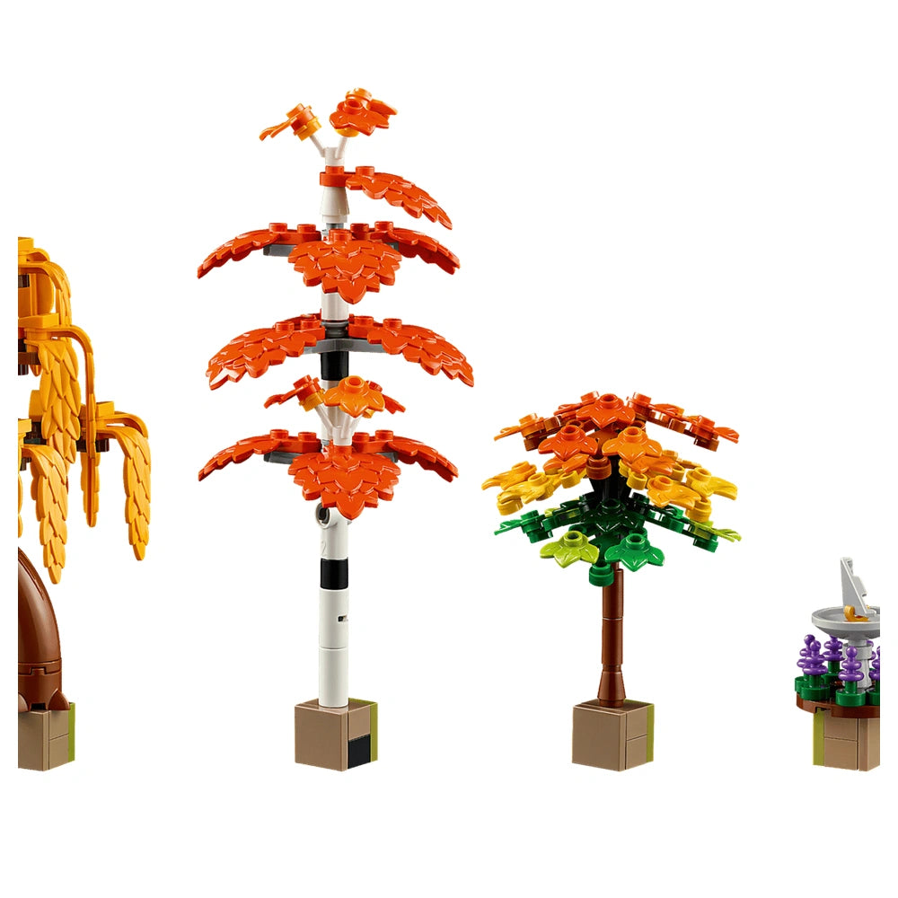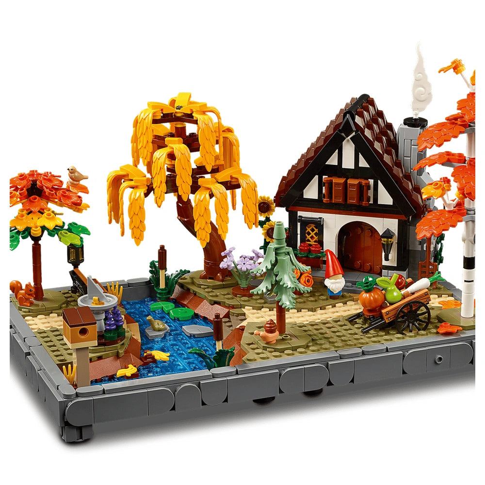 The Autumn Cottage Garden set features a charming cottage inspired by fairy-tale aesthetics, complete with intricate details that bring the scene to life. With 1,102 pieces, you can construct a picturesque garden that includes a variety of trees such as a birch, a weeping willow, a blue spruce, and a maple, all adorned with seasonal flowers. The set also includes delightful elements like a sundial, a birdhouse, a vegetable cart, a garden gnome, and a serene stream with stones for crossing, making it a perfect addition to any home or office decor.