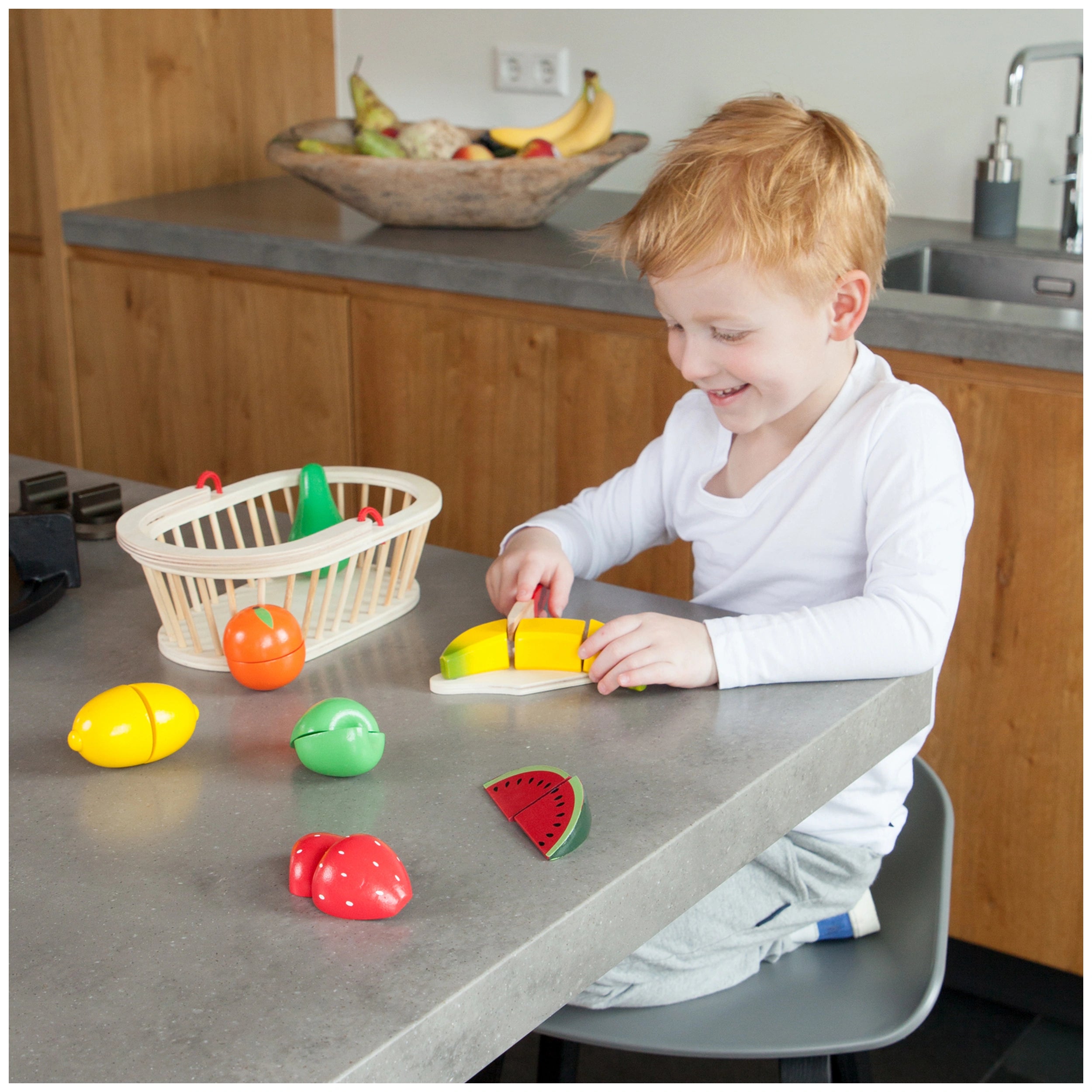 The New Classic Toys Cuttingset includes a variety of beautifully crafted wooden fruits, including a watermelon, strawberry, pear, apple, lemon, banana, and orange. Each piece is designed to be cut in half, allowing children to engage in pretend cooking and meal preparation. The set comes complete with a cutting board and a pretend knife, making it easy for little chefs to chop their fruits and create delicious, imaginative meals. The velcro fastening on each fruit piece allows for seamless reassembly, promoting problem-solving skills and reinforcing the concept of whole and half.