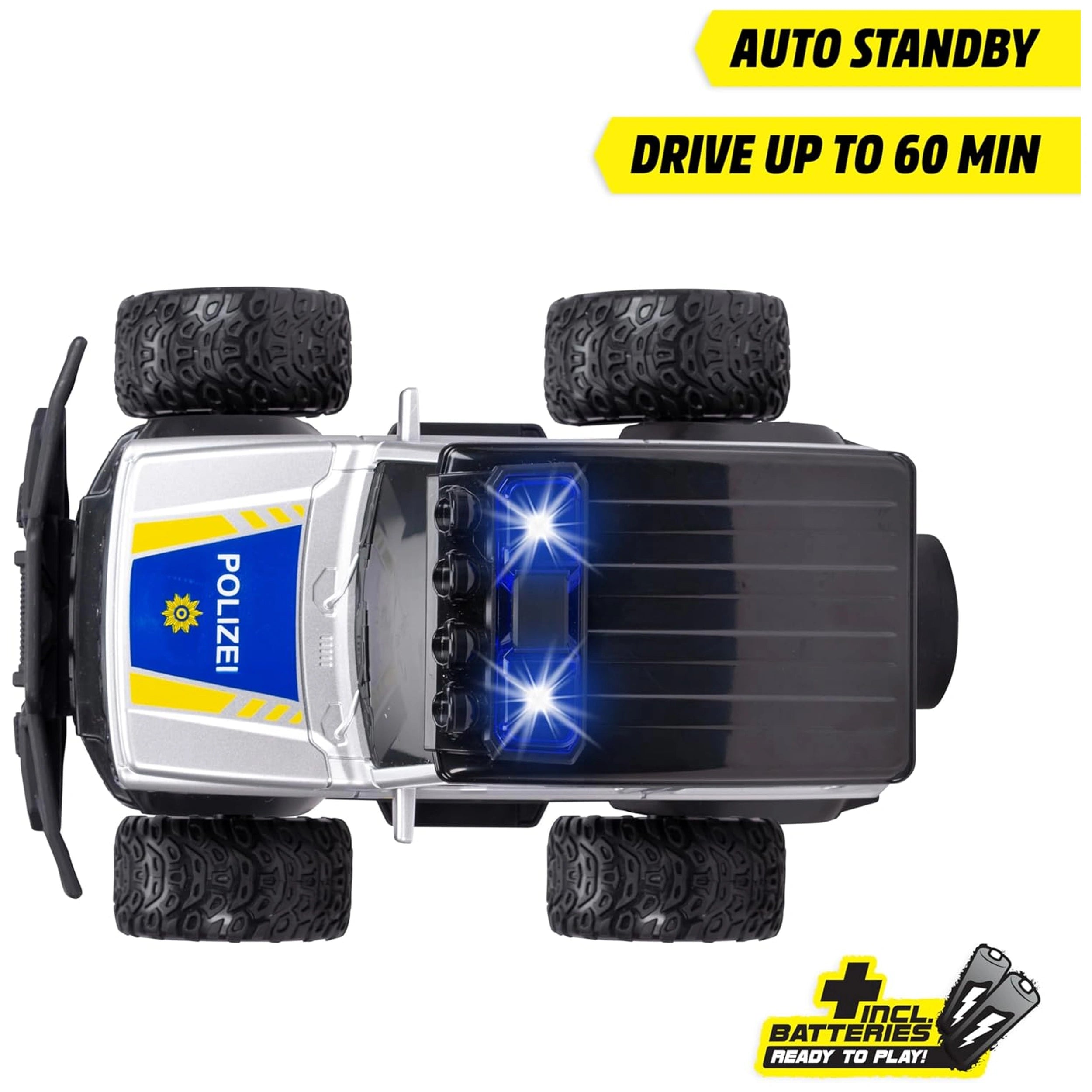 Technical specifications further elevate the Dickie RC Police Offroader. It comes equipped with a 2-channel remote control operating at 2.4 GHz, allowing for up to 16 vehicles to operate simultaneously without interference. The vehicle measures 20 cm in length and boasts a standby mode that conserves battery life, ensuring that the fun lasts longer. With a driving time of up to 60 minutes on a single charge, kids can enjoy extended play sessions without interruption.