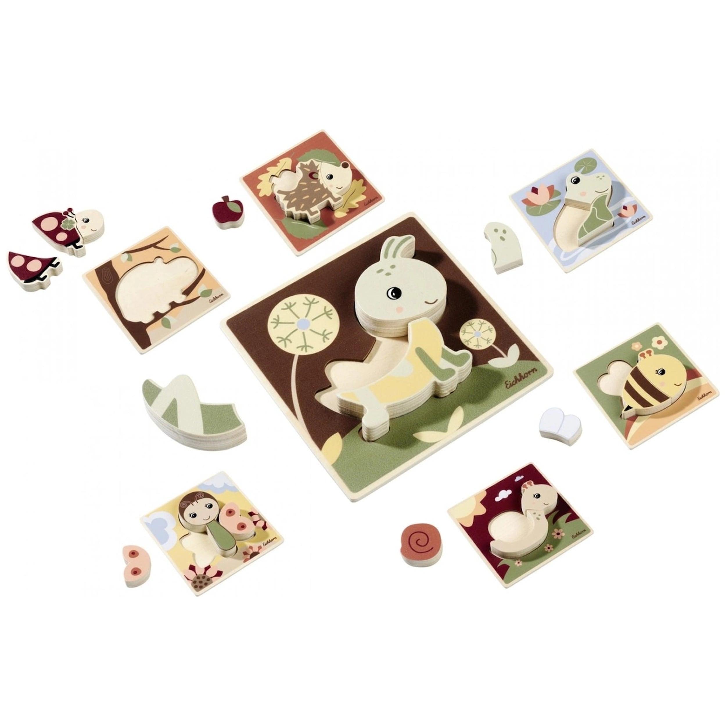 Introducing the Eichhorn Wooden Animal Puzzle, a delightful and educational toy designed to engage young minds while fostering creativity and cognitive development. This charming puzzle features a random selection of adorable animal motifs, each measuring 13x13 cm, making it the perfect size for little hands to manipulate. With seven different designs, including a grasshopper, ladybug, bee, snail, butterfly, frog, and hedgehog, children will be captivated by the vibrant colors and playful shapes that bring each character to life.