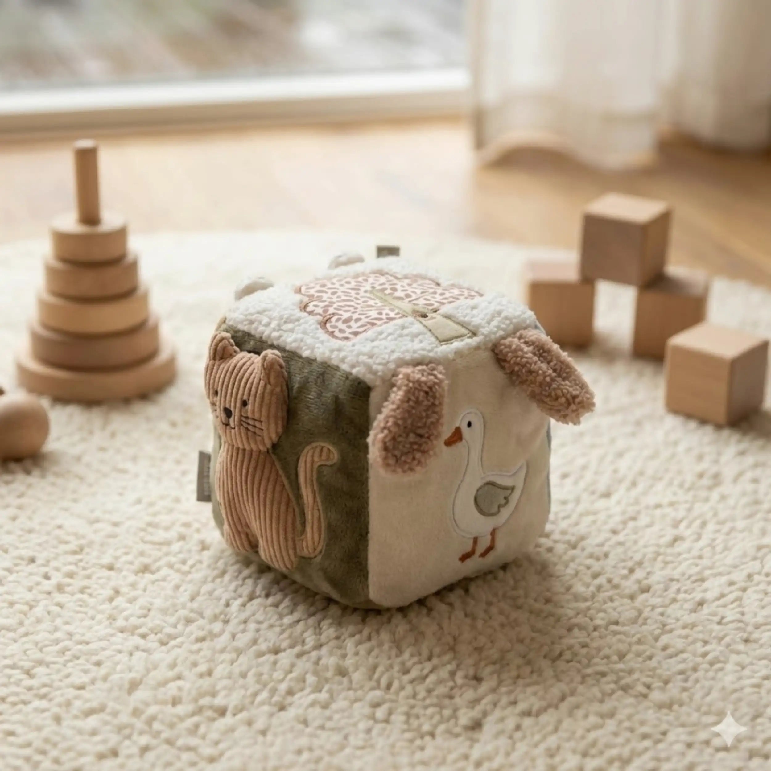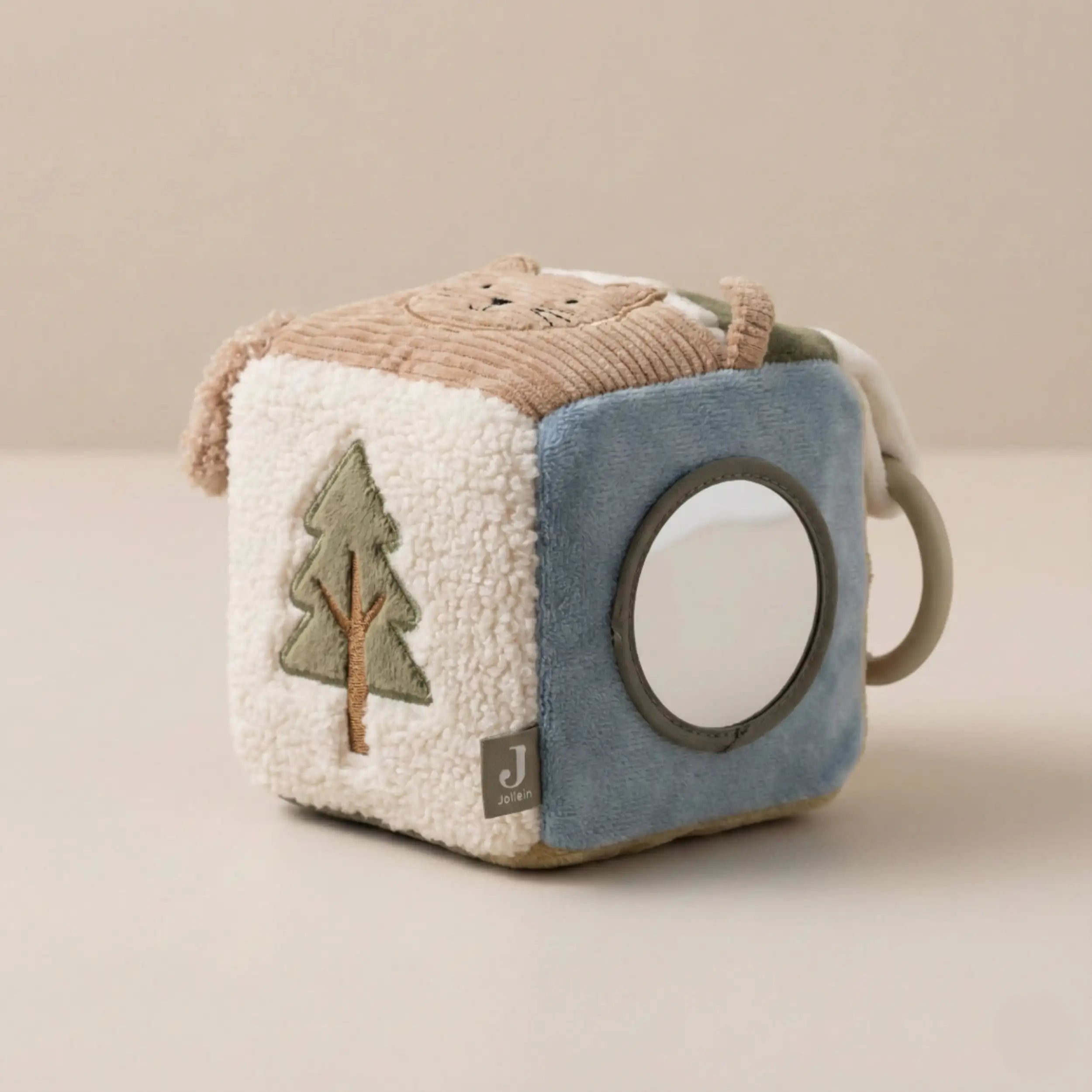 Introducing the Jollein Activity Cube from the Tiny Park collection, a delightful addition to your baby's toy collection. This enchanting soft activity cube is designed to engage your little one’s senses while promoting essential motor skills. With its charming animal characters, including a cat, dog, and owl, this toy is not only visually appealing but also serves as an interactive learning tool for infants.