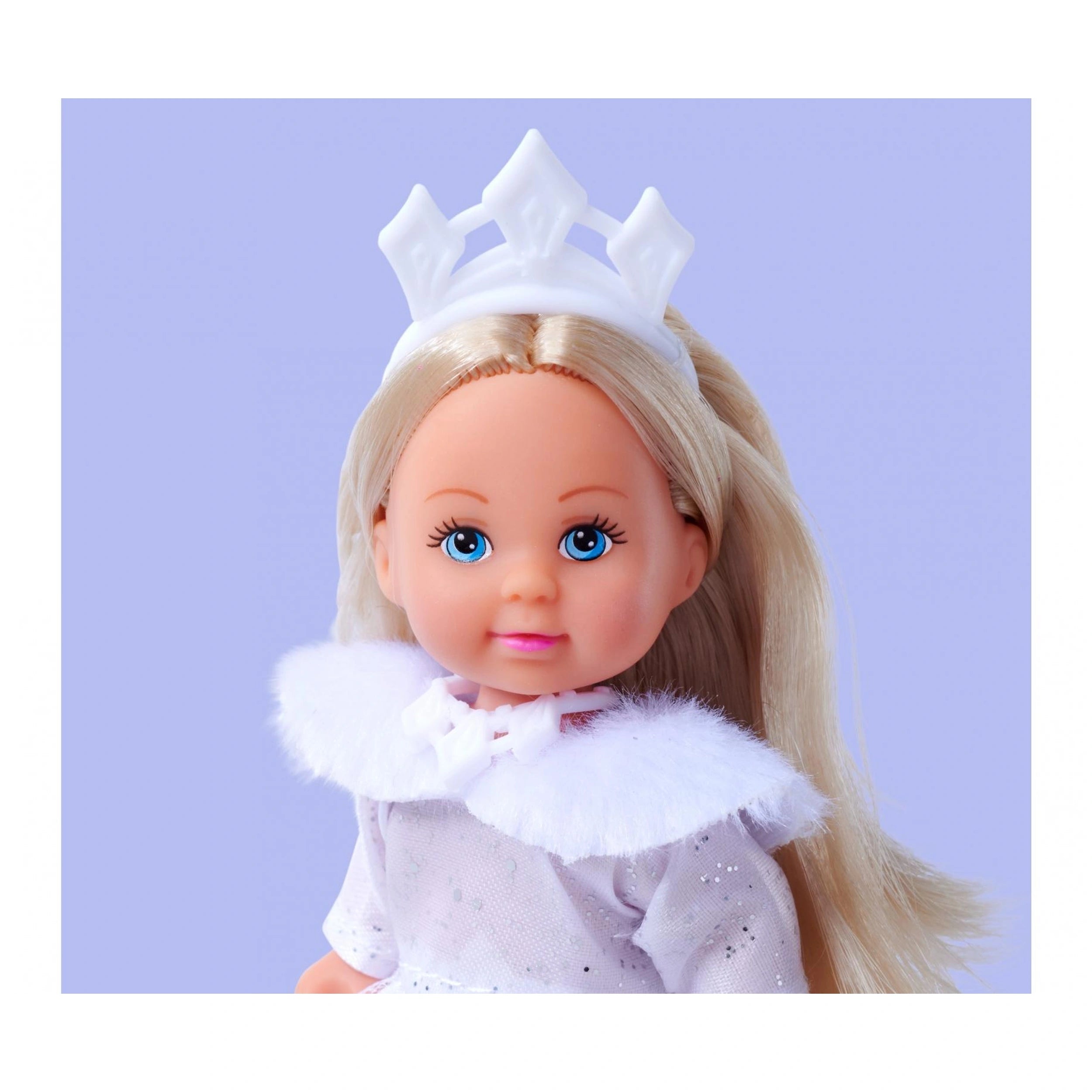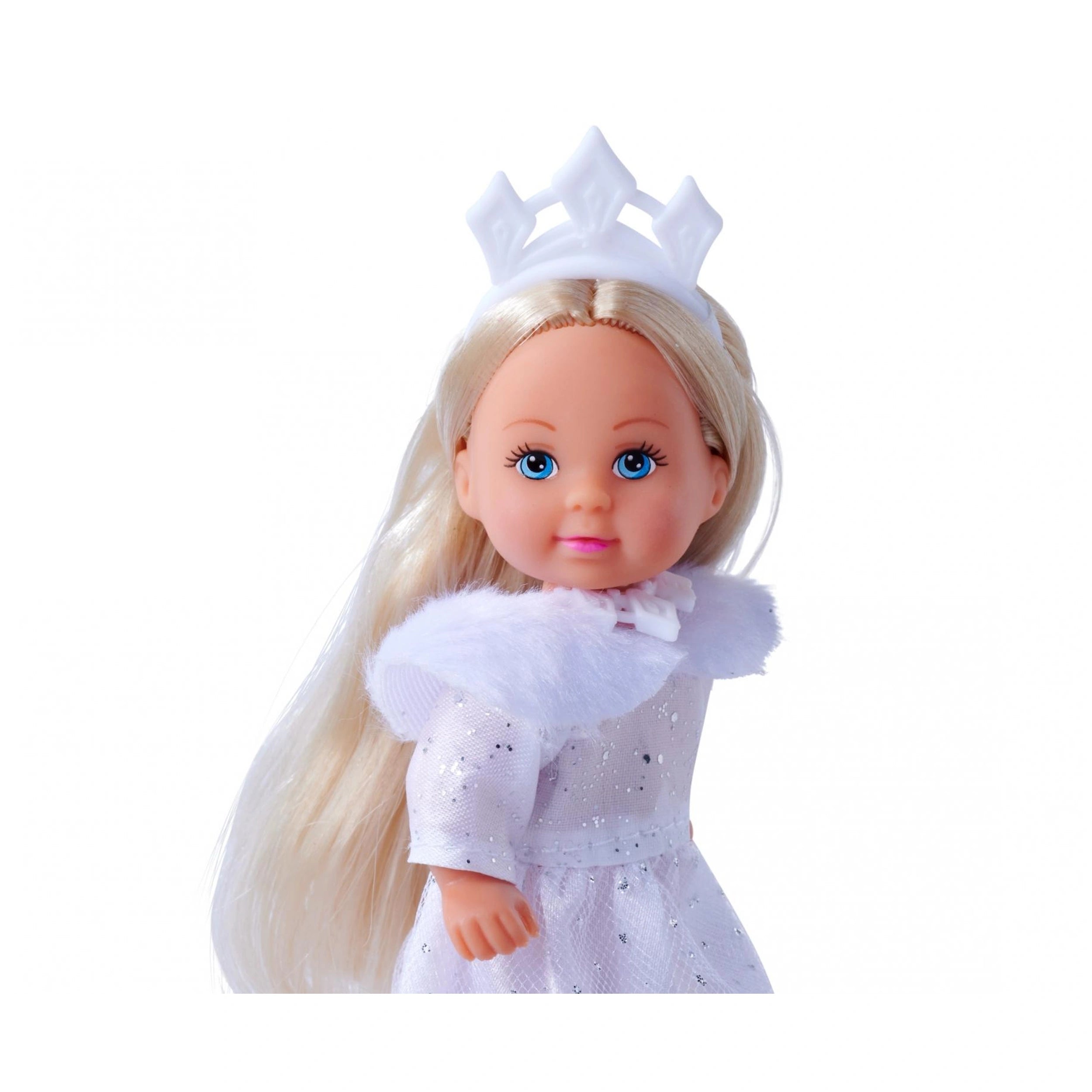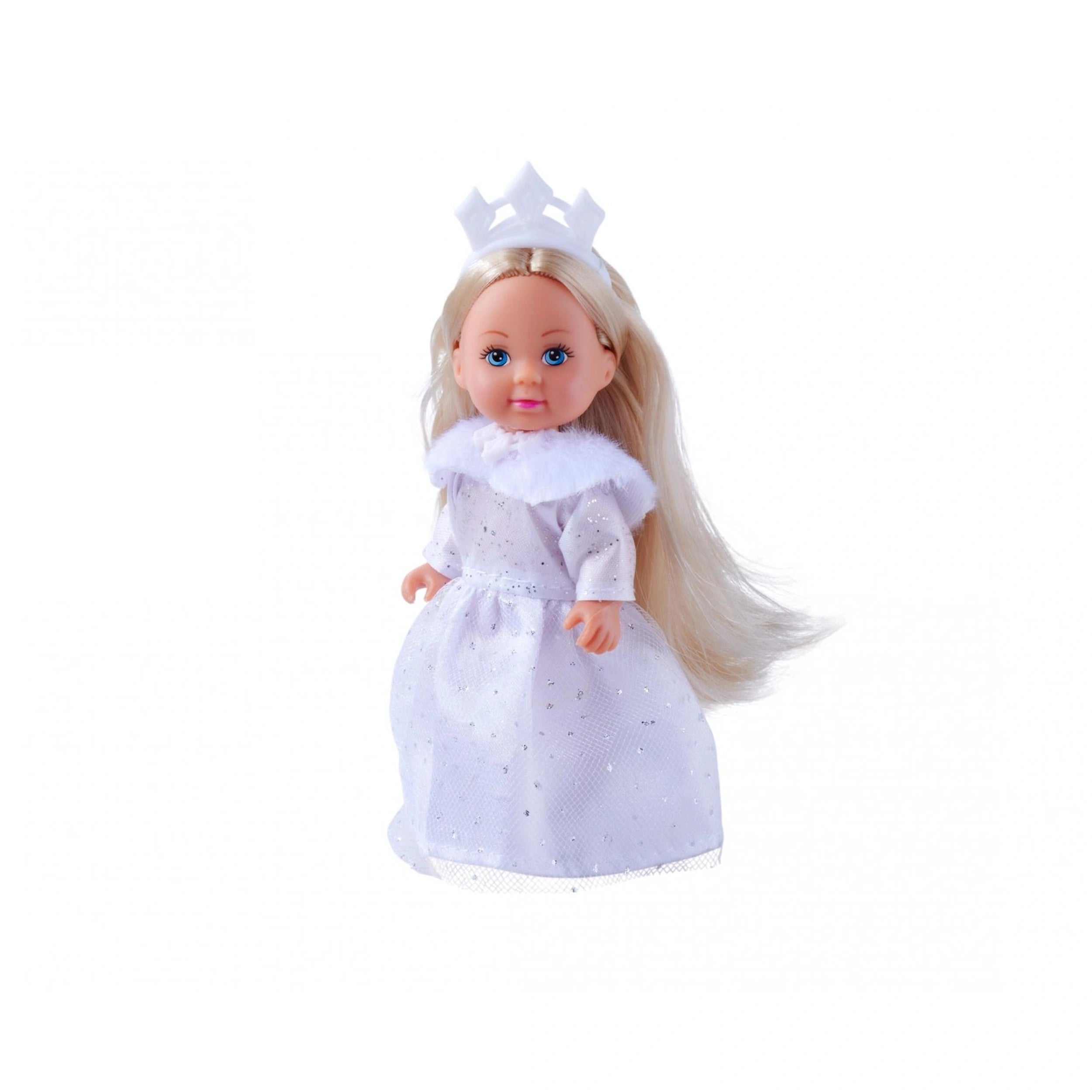 The Evi LOVE Dream Princess doll is not just a toy; it's an opportunity for children to explore their fashion sense and storytelling abilities. Dressed in a stunning white winter gown adorned with sparkling glitter elements, Evi radiates a magical charm that is sure to delight. The long-sleeved dress is complemented by a stylish fur stole, adding an extra touch of sophistication to her royal appearance. With her beautiful crown perched atop her head, Evi is ready to take on the role of a princess in any imaginative scenario.