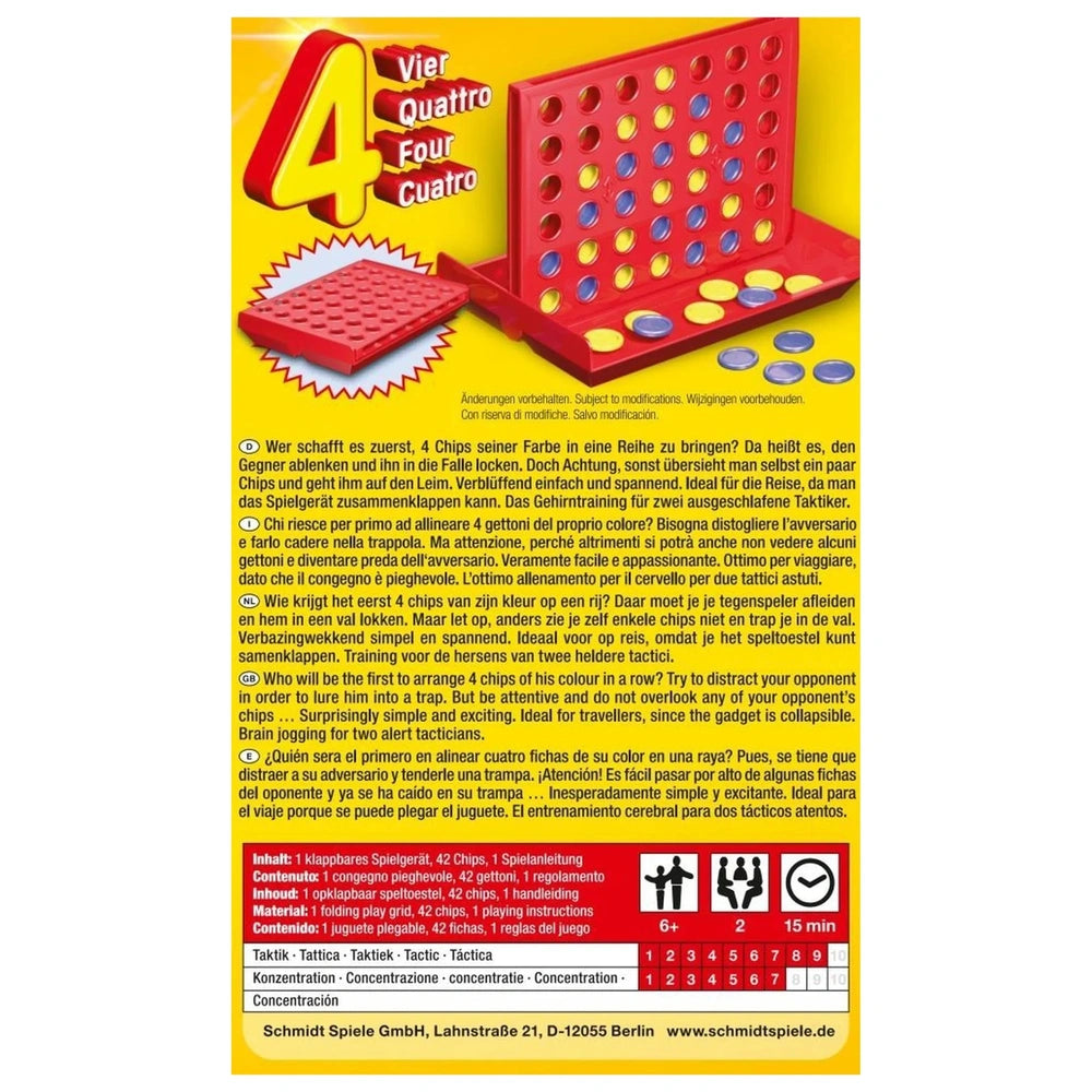 Introducing Schmidt Spiele - Four, an engaging children's travel board game that promises hours of strategic fun and mental stimulation. This classic game challenges players to connect four chips of their color in a row,...