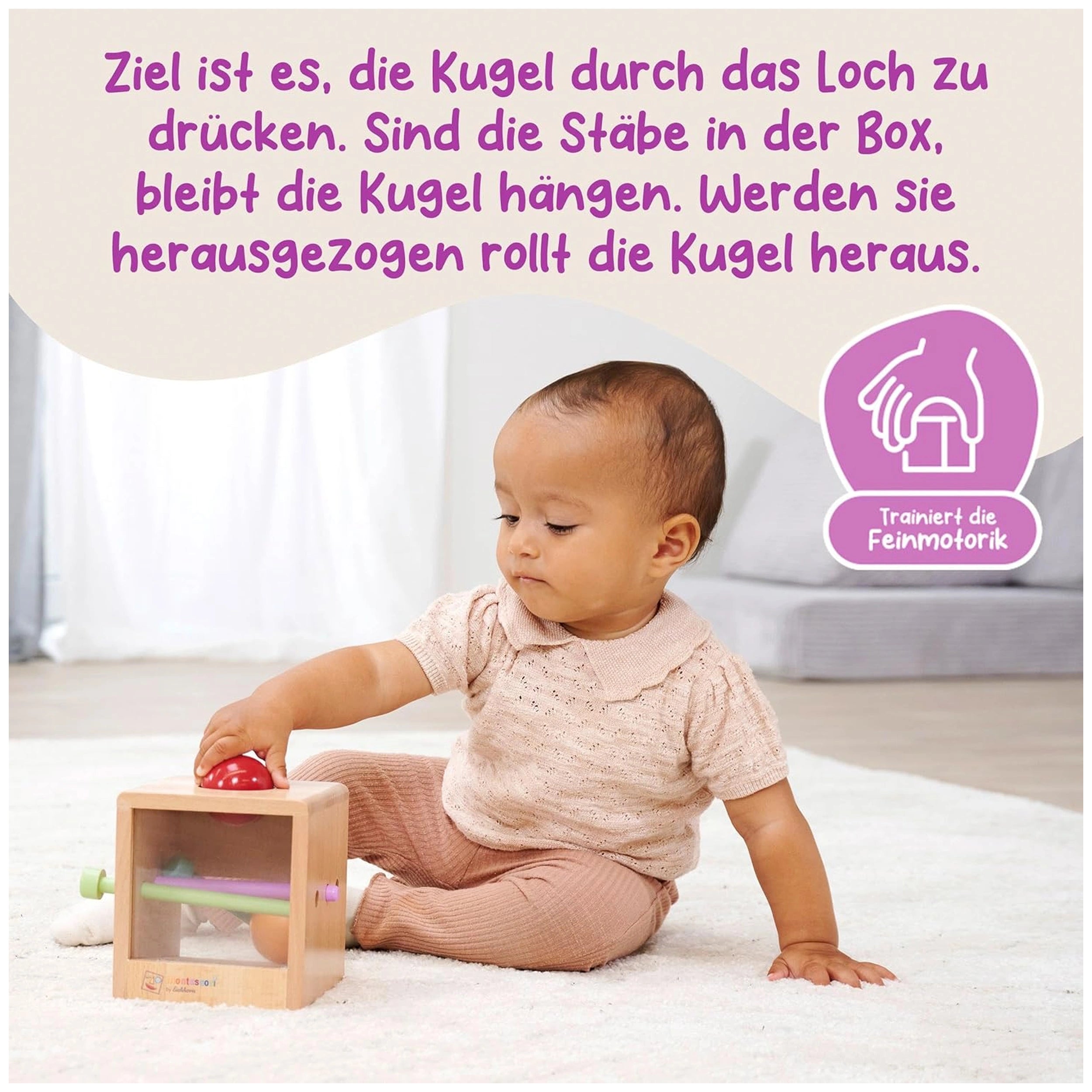 Introducing the Eichhorn Montessori Wooden Bix Baby Activity Toy, a thoughtfully designed educational tool that captivates and engages young minds. This interactive toy features a viewing window, three rods, and two balls, providing endless opportunities for exploration and discovery for children aged one and up. The unique design encourages little ones to insert and remove the rods, allowing them to grasp the concept of cause and effect in a playful manner.
