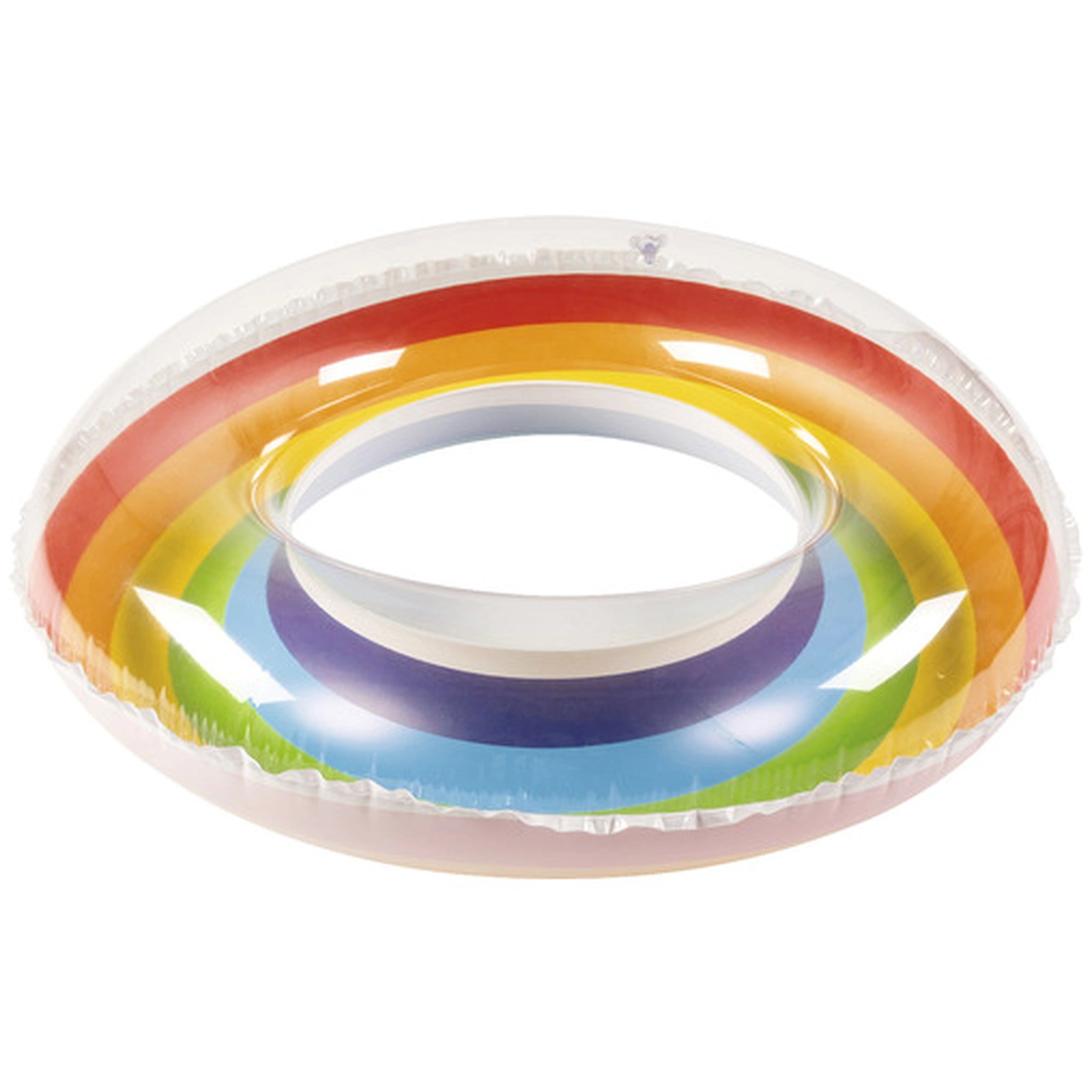 Introducing the Happy People Rainbow Swimming Ring, a vibrant and playful accessory designed to enhance your summer poolside experience. Measuring approximately 65 cm when inflated and 70 cm when deflated, this swim ring is the perfect size for both children and adults looking to relax and enjoy the water. Its eye-catching design features a transparent top that allows for a clear view of the water beneath, while the colorful rainbow pattern on the bottom adds a splash of fun and excitement to any swimming adventure.
