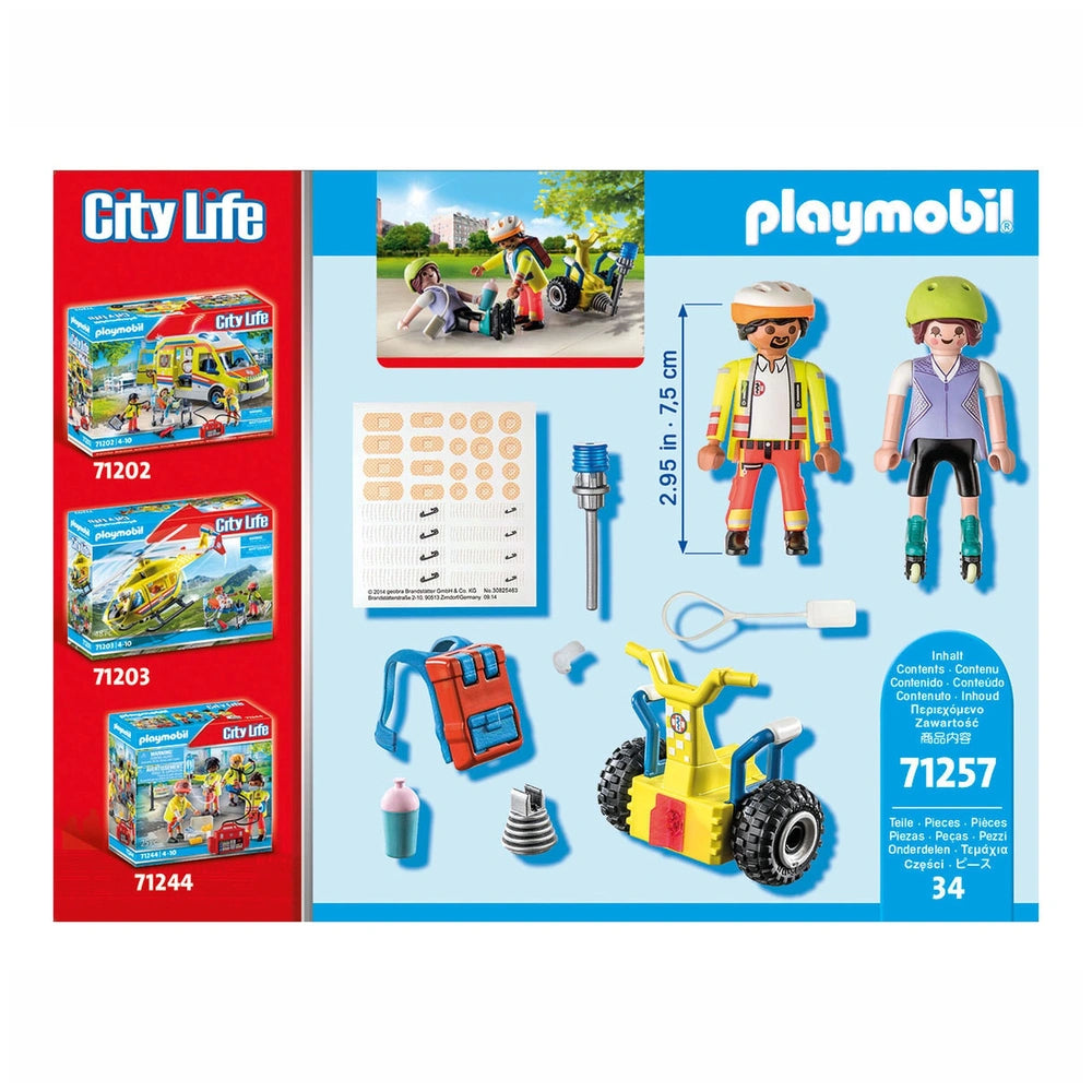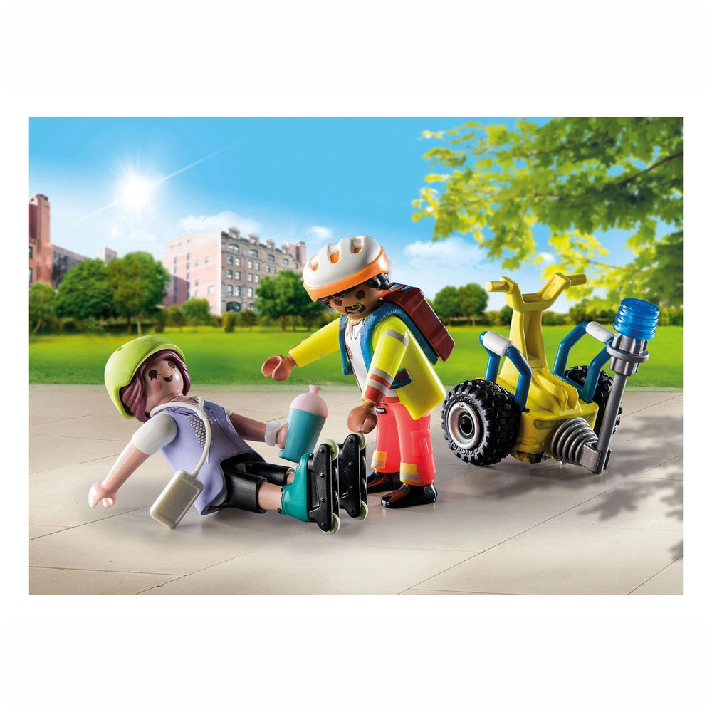The scenario unfolds in a lively park where an inline skater has taken a tumble and requires immediate assistance. The dedicated paramedic, equipped with a speedy Segway, is ready to spring into action. This dynamic vehicle allows for swift movement through narrow paths, ensuring that help arrives promptly. Children will love reenacting the rescue mission as they navigate the park setting, fostering a sense of empathy and responsibility while playing.