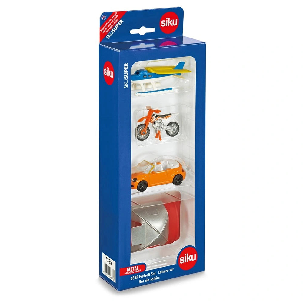 Introducing the Siku Leisure Set, a captivating toy playset designed to ignite the imagination of children and provide endless hours of entertainment. This meticulously crafted set brings the excitement of outdoor adventures right into your living room, featuring a vibrant orange convertible, a thrilling motocross bike, and a dynamic seaplane. Each element of the set is designed to inspire creativity and storytelling, making it an ideal addition to any child's toy collection.