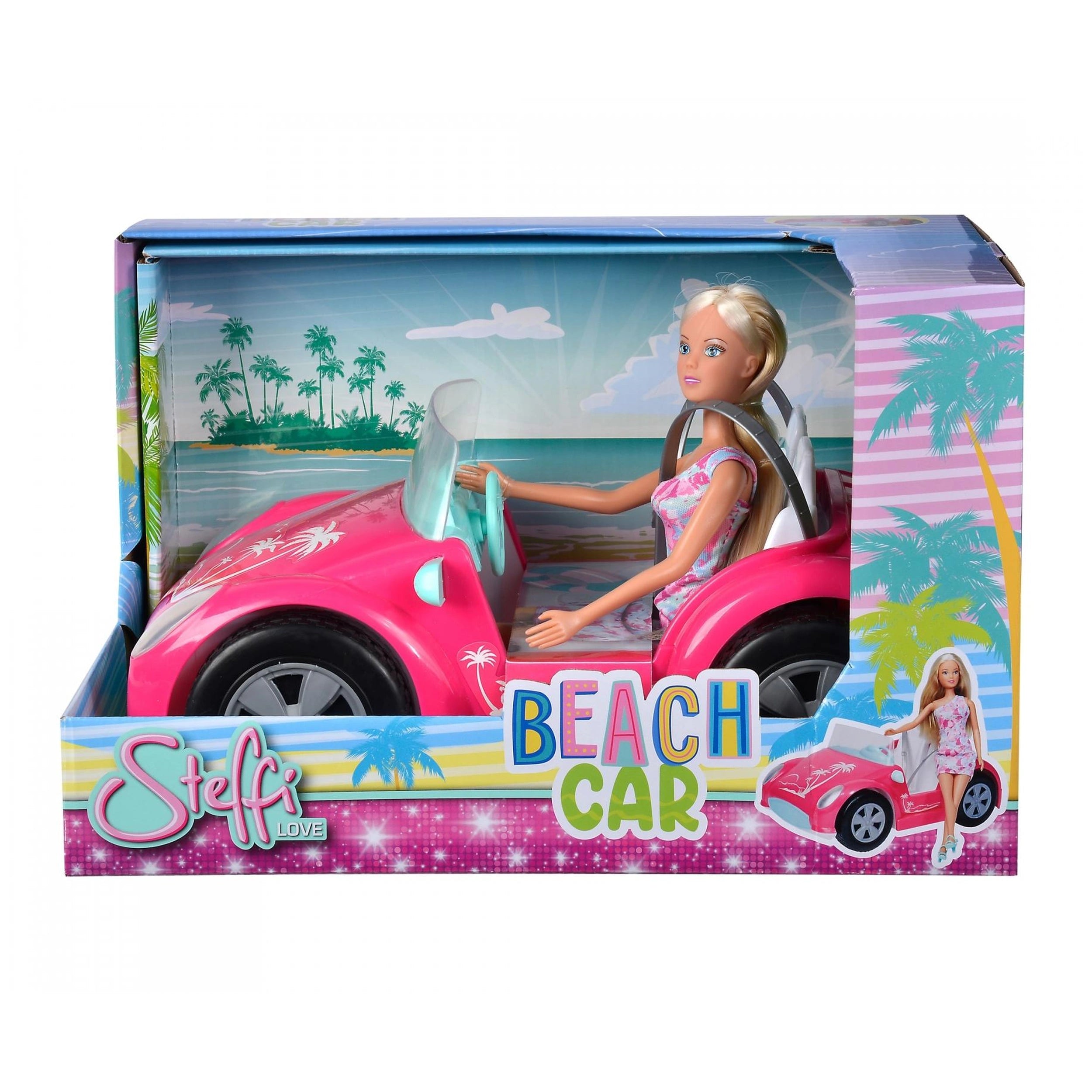 The Steffi LOVE Beach Car set includes not only the charming Steffi doll but also an array of accessories that enhance the play experience. The pink convertible is designed with attention to detail, featuring a sleek design that appeals to young fashionistas. The car's vibrant color and stylish features make it a standout piece in any toy collection. Children can easily place Steffi in the driver's seat, allowing them to create their own stories and adventures as they navigate through their imaginative worlds.