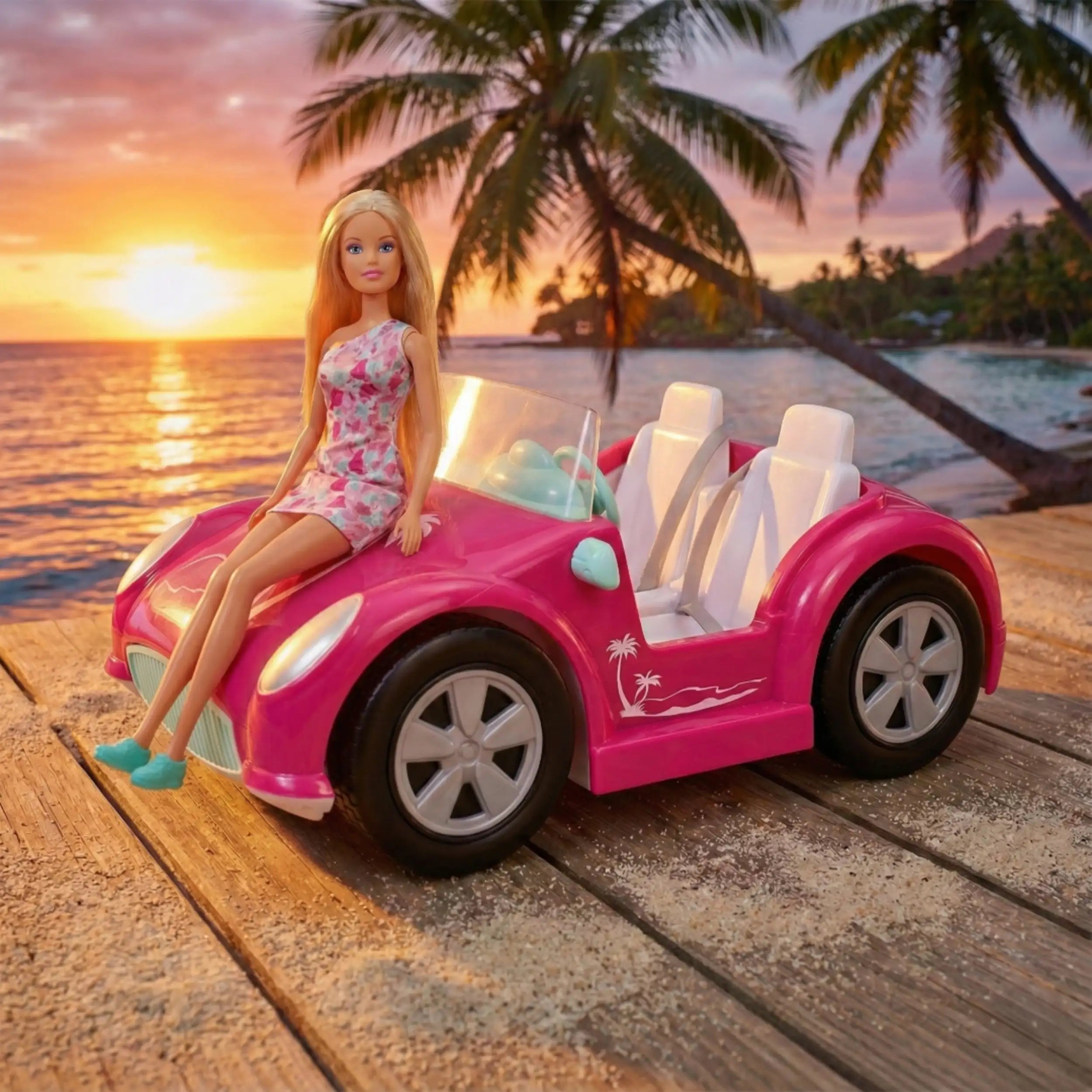 A doll named Steffi Love sitting next to a pink convertible car with white and lighter pink detailing. Steffi Love is wearing a floral dress.