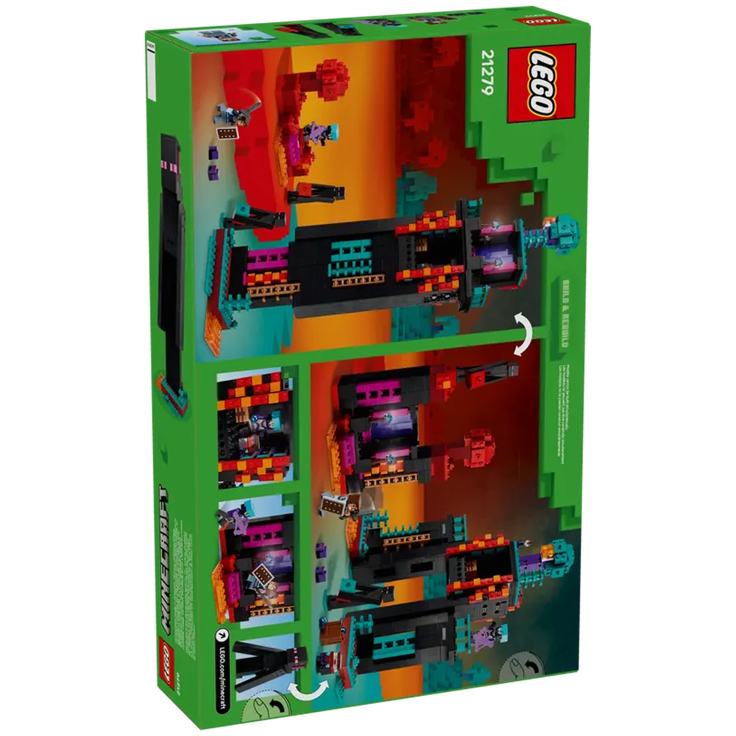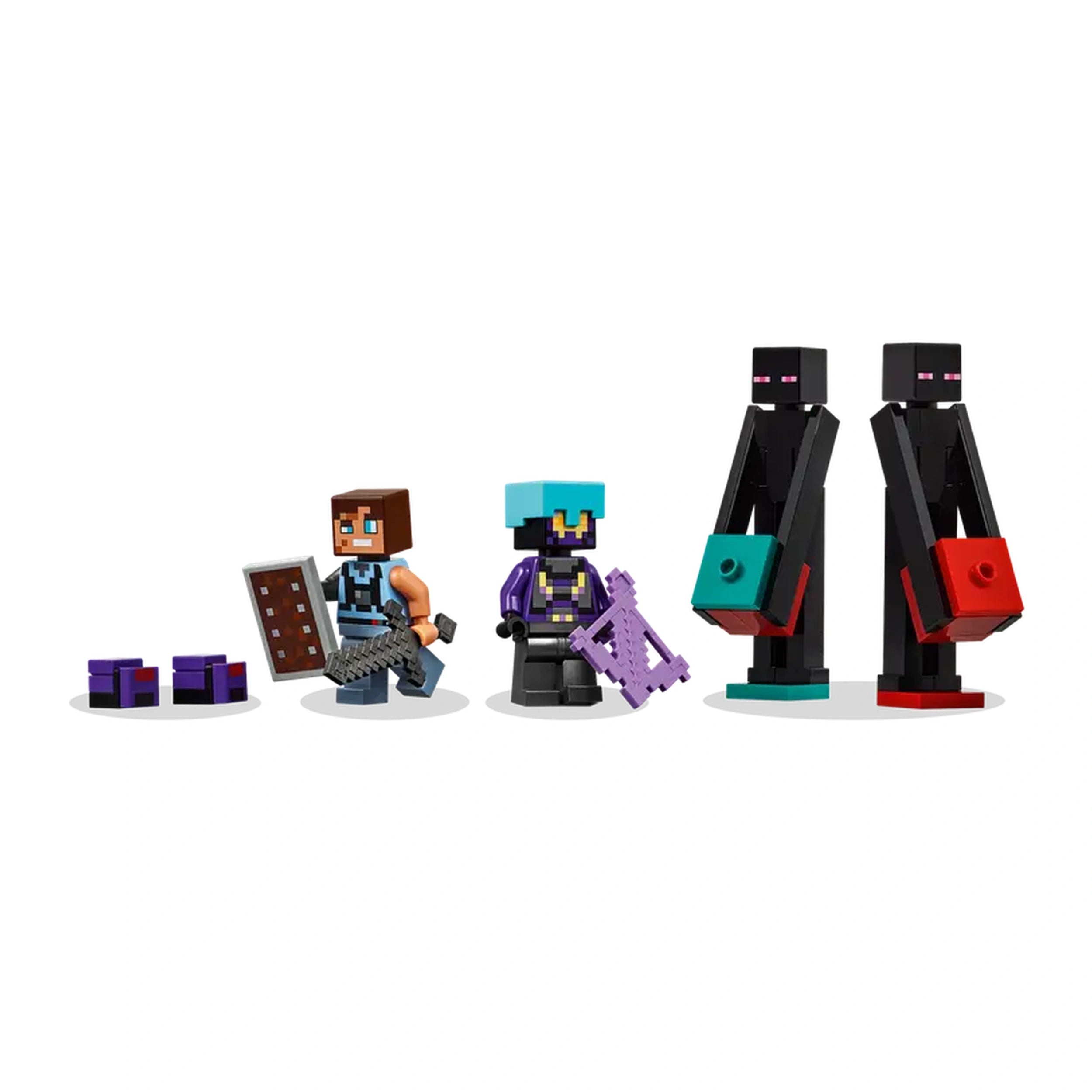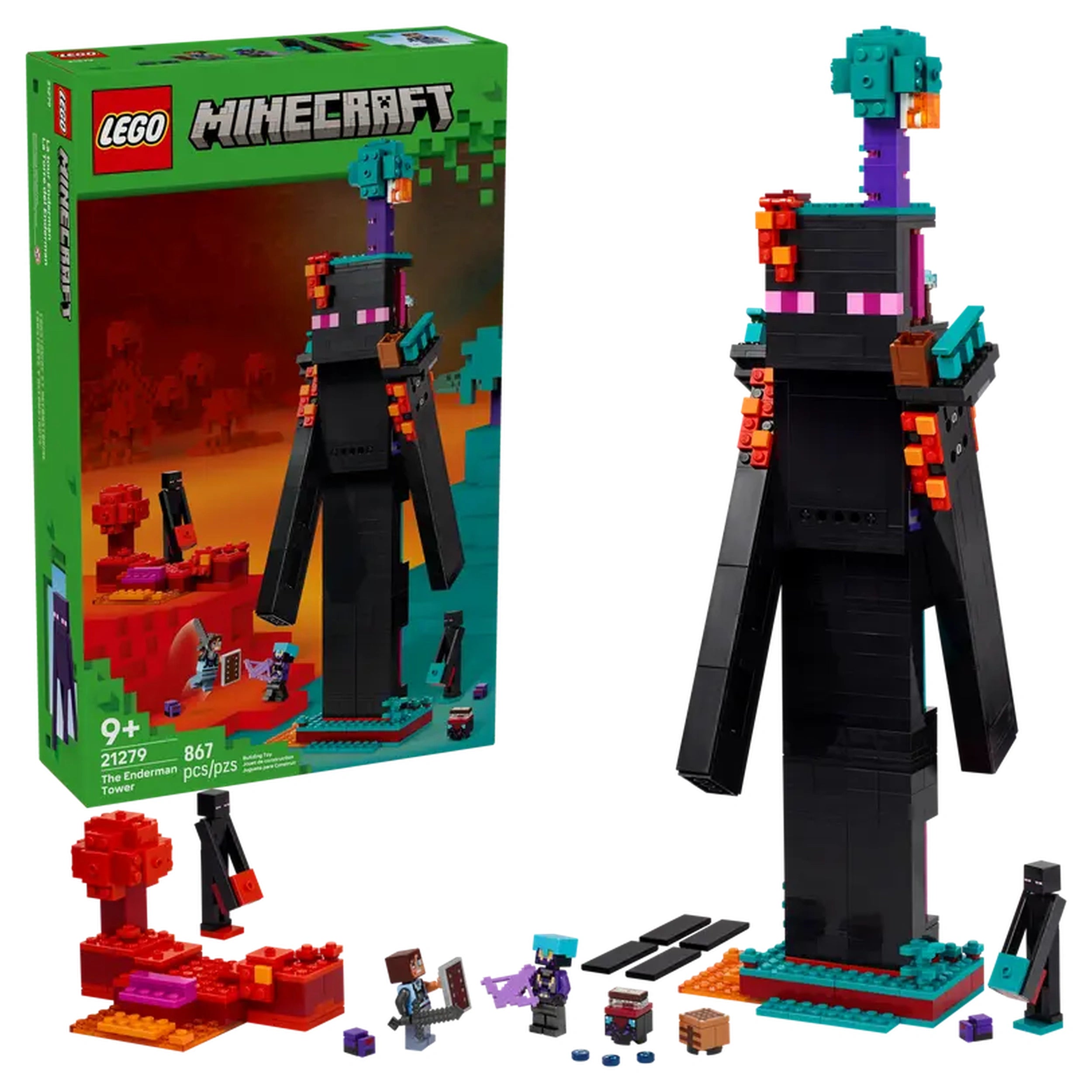 Included in the set are a variety of collectible minifigures, including a Dimensional Defender, a Realm Raider, and two Enderman figures, along with two Endermite mob figures. To equip players for their adventures, the set comes with an enchanted crossbow, a netherite sword, and a shield, ensuring that every battle is action-packed. The versatility of the Enderman Tower allows it to be rebuilt into two color-coded fortresses, perfect for exciting Player versus Player (PvP) scenarios, making it a fantastic addition to any Minecraft-themed collection.