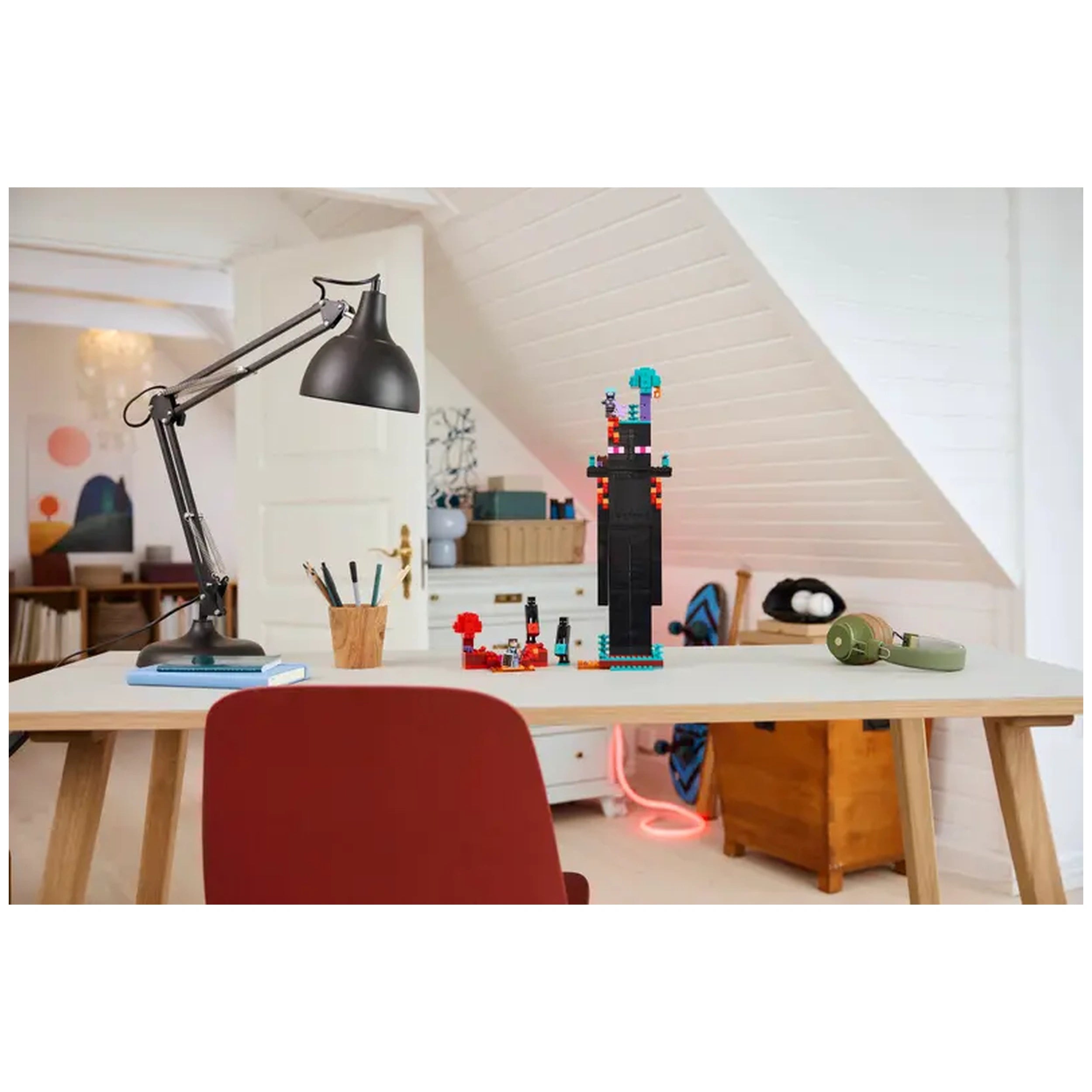 The centerpiece of this construction set is the impressive Enderman-shaped tower, complete with a Nether portal nestled within its head. This striking design features balconies on each shoulder and two fully furnished rooms that include a crafting table, an enchanting table, and a storage box for Ender pearls. The thoughtful arrangement of ladders allows easy access to the tower's upper levels, while the posable arms add an interactive element that enhances the play experience. Outside, builders will find elements inspired by the warped forest and crimson forest biomes, bringing the Minecraft world to life in a tangible way.