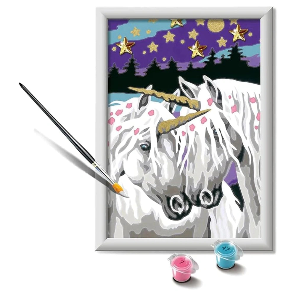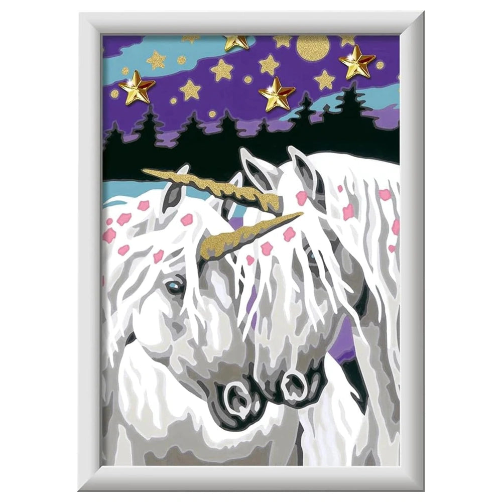 Ravensburger presents a captivating painting kit designed for children aged 9 and up, within the category of Arts & Crafts. This product is a painting by numbers set that offers a magical artistic experience, allowing young creators to express themselves while developing their skills. The Unicorns in Love kit combines structured learning with creativity, ensuring that every child can produce a beautiful masterpiece that celebrates companionship.