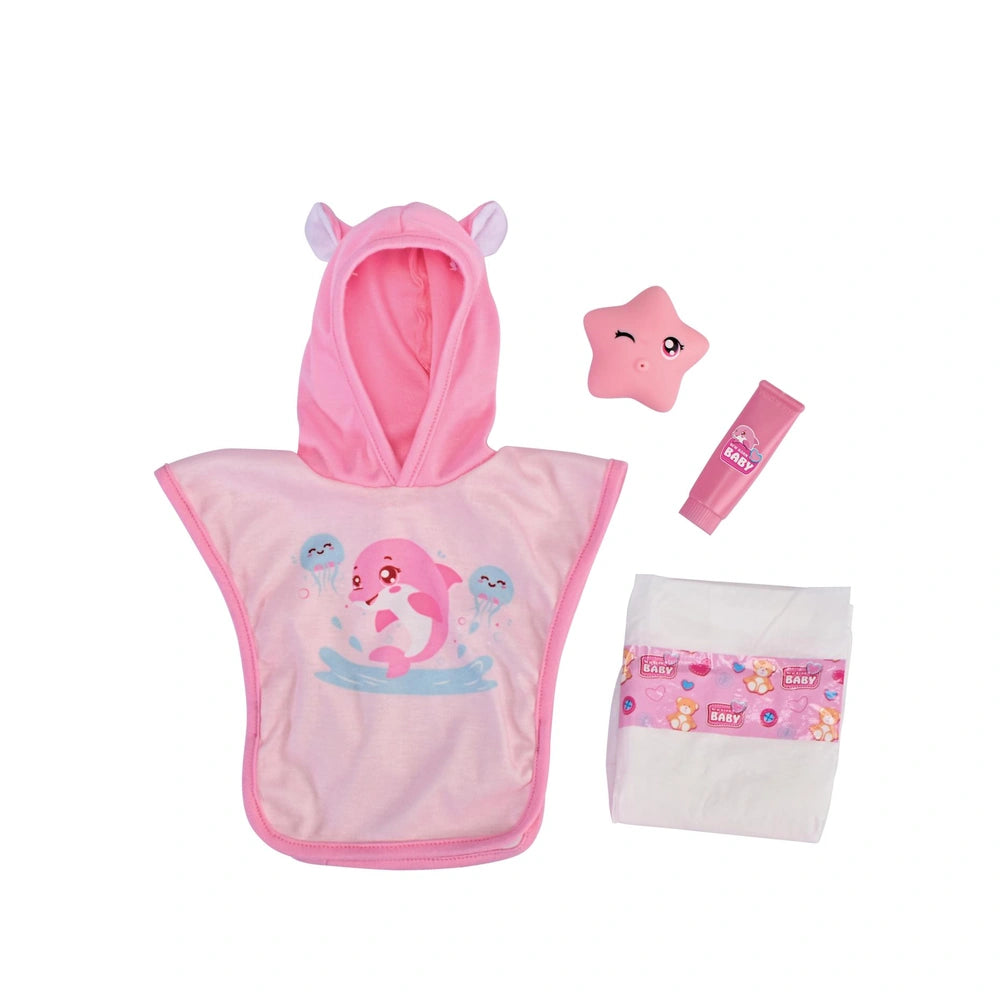 In addition to the bath poncho, the set comes with a soft doll diaper that is simple for small hands to manipulate, a pretend cream tube for post-bath care, and a star-shaped water splash toy that adds an element of fun during bath time. These accessories are crafted to stimulate creativity and encourage role-play, allowing children to develop empathy and social skills as they care for their dolls.