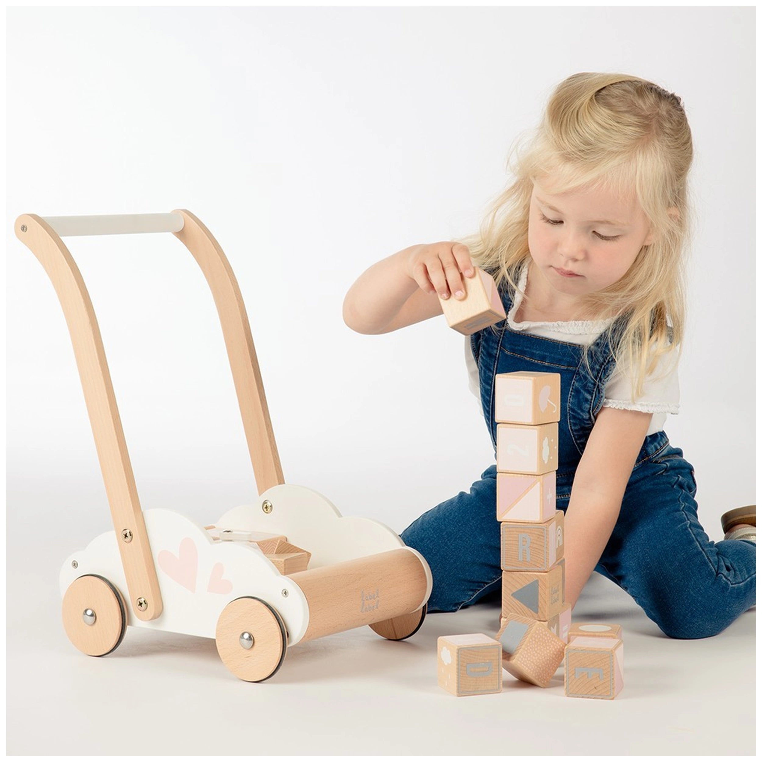 Introducing the Label-Label Educational Baby Walker in Pink, a delightful and engaging toy designed to support your child's early development. Crafted from high-quality FSC certified beech wood, this baby walker combines durability with aesthetic appeal, making it a perfect addition to any playroom. The soft blue, white, and grey tones, applied with child-friendly water-based paint, create a visually pleasing environment that encourages exploration and creativity.