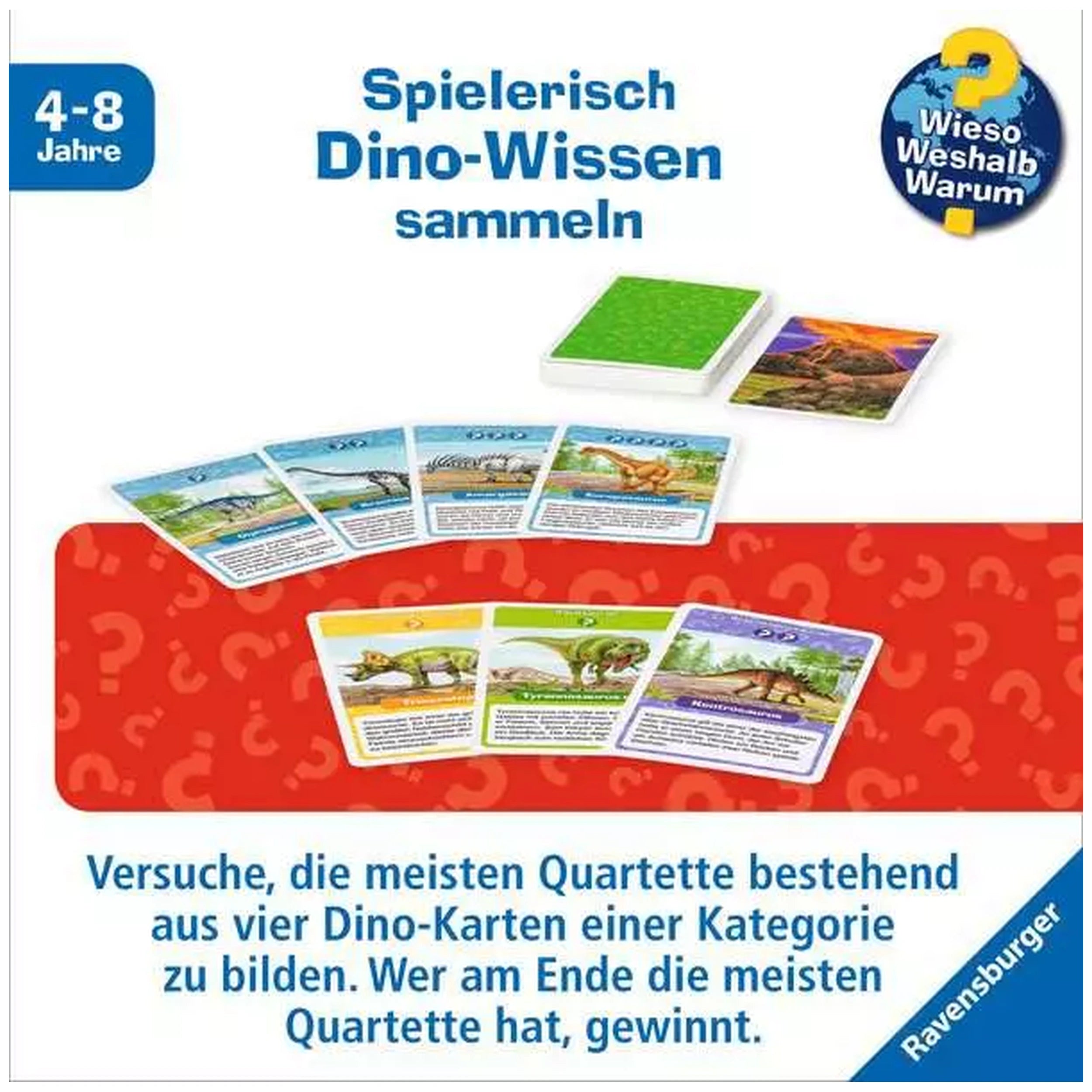 Introducing the Ravensburger - Wieso? Weshalb? Warum? Dinosaurier Quartett, a captivating board game designed for young dinosaur enthusiasts. This engaging card game invites players to explore the fascinating world of dinosaurs through a fun and educational format. With its vibrant illustrations and informative texts, this game not only entertains but also enriches players' knowledge about these magnificent prehistoric creatures.
