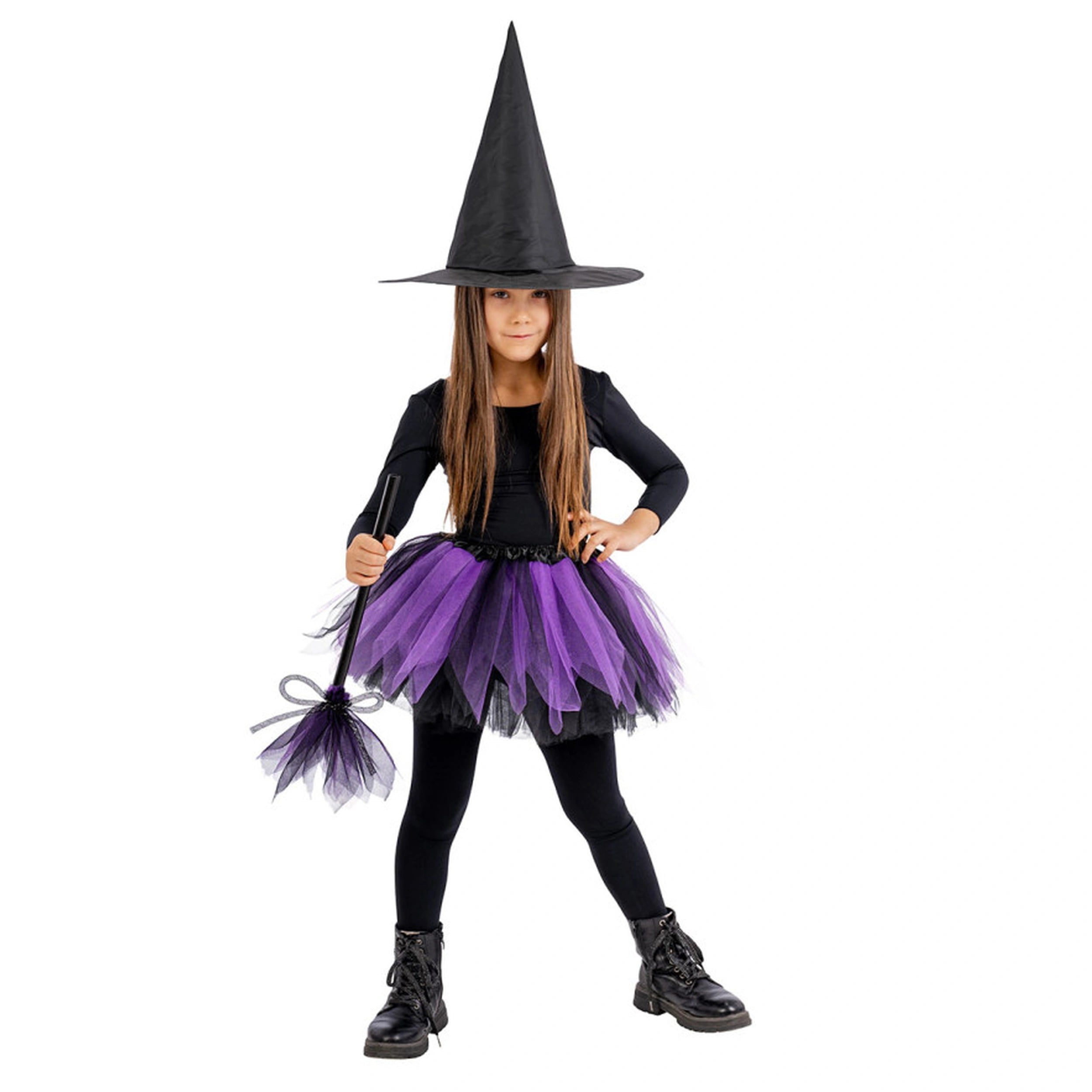 Completing the set is a lightweight plastic broomstick adorned with tulle, measuring 33 cm in length. This accessory not only enhances the overall look but also encourages active play, as children can pretend to fly through the skies on their magical broom. The combination of these elements creates a captivating costume that is ideal for Halloween parties, themed events, or simply for imaginative play at home.
