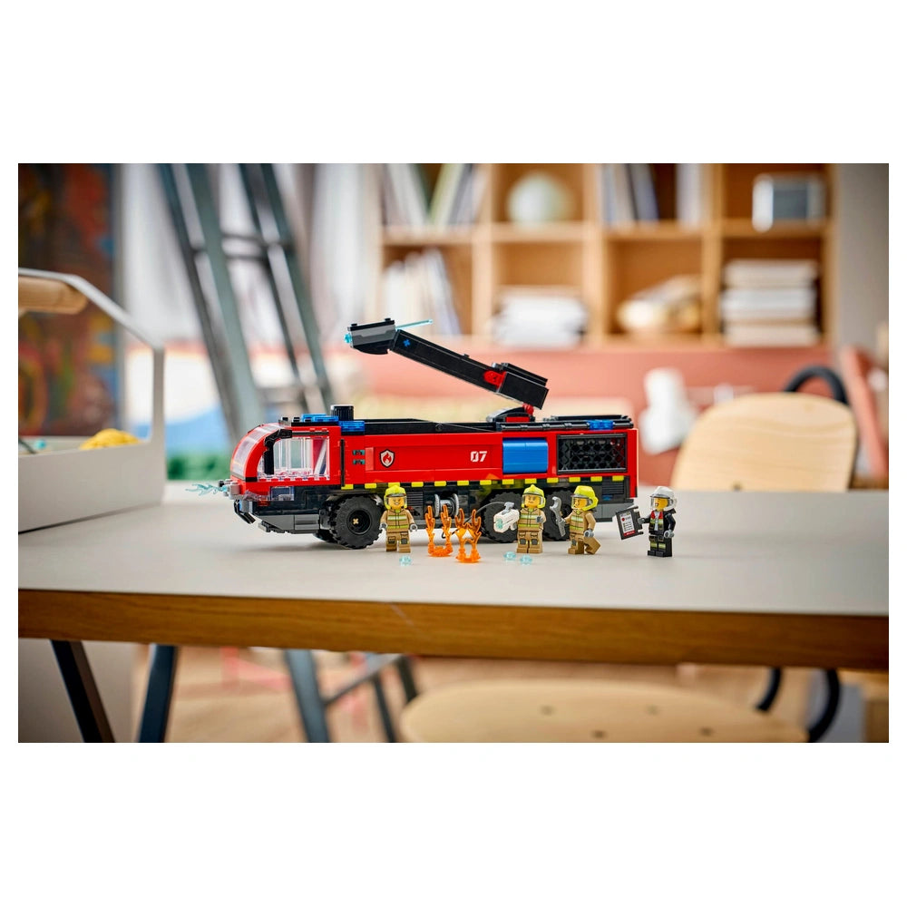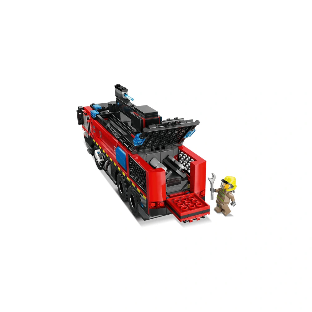 The LEGO® City Airport Fire Truck set includes 691 pieces, allowing kids to construct a detailed model of a fire truck equipped with a 360° rooftop extinguisher. This unique feature enables children to simulate real-life firefighting situations, launching water elements to extinguish imaginary flames. The truck also boasts opening side equipment bays and tool storage compartments, ensuring that all necessary firefighting gear is readily accessible for the four included firefighter minifigures.