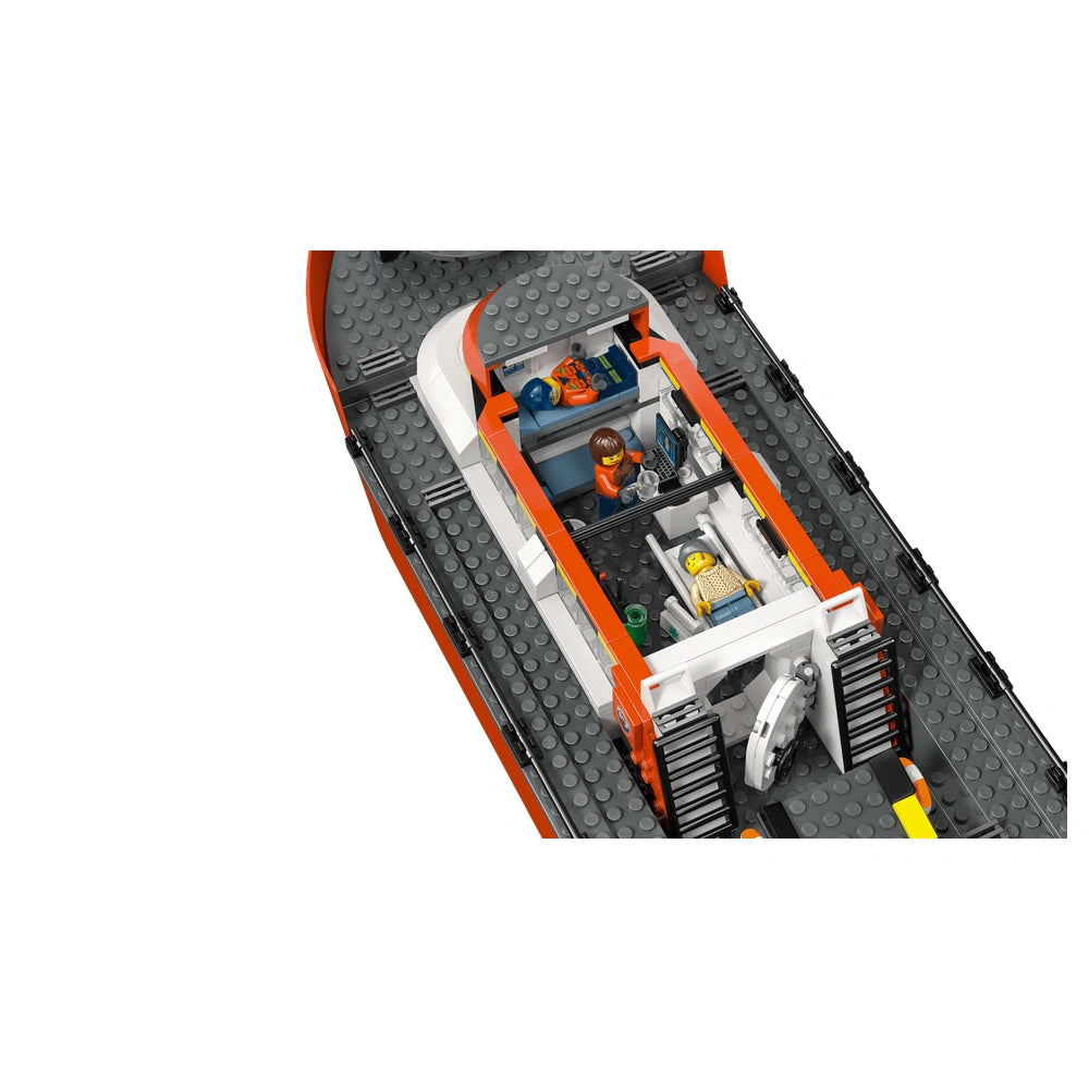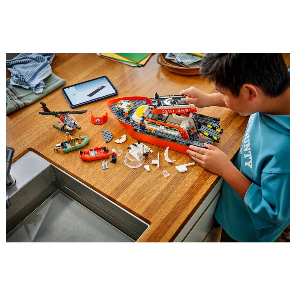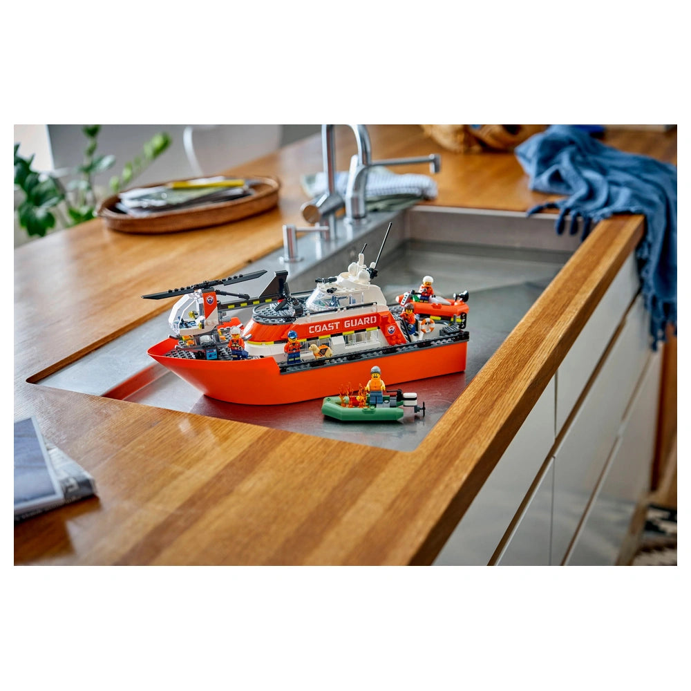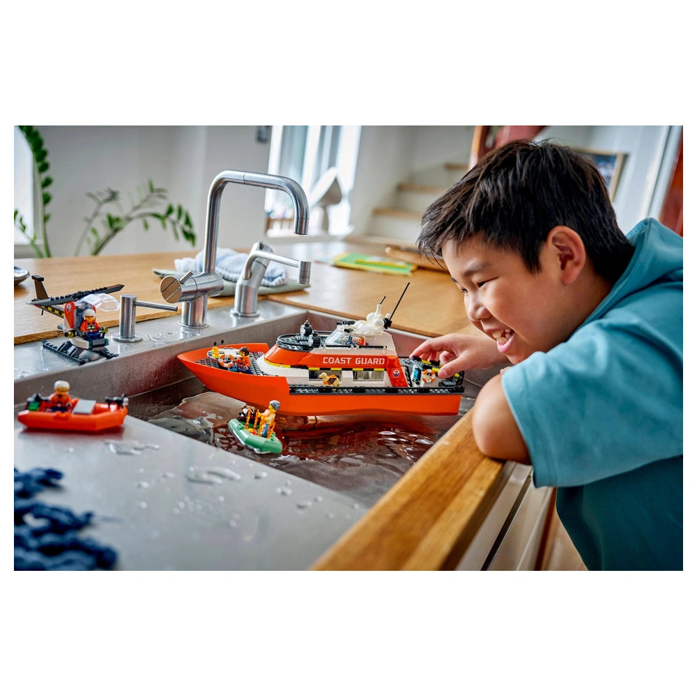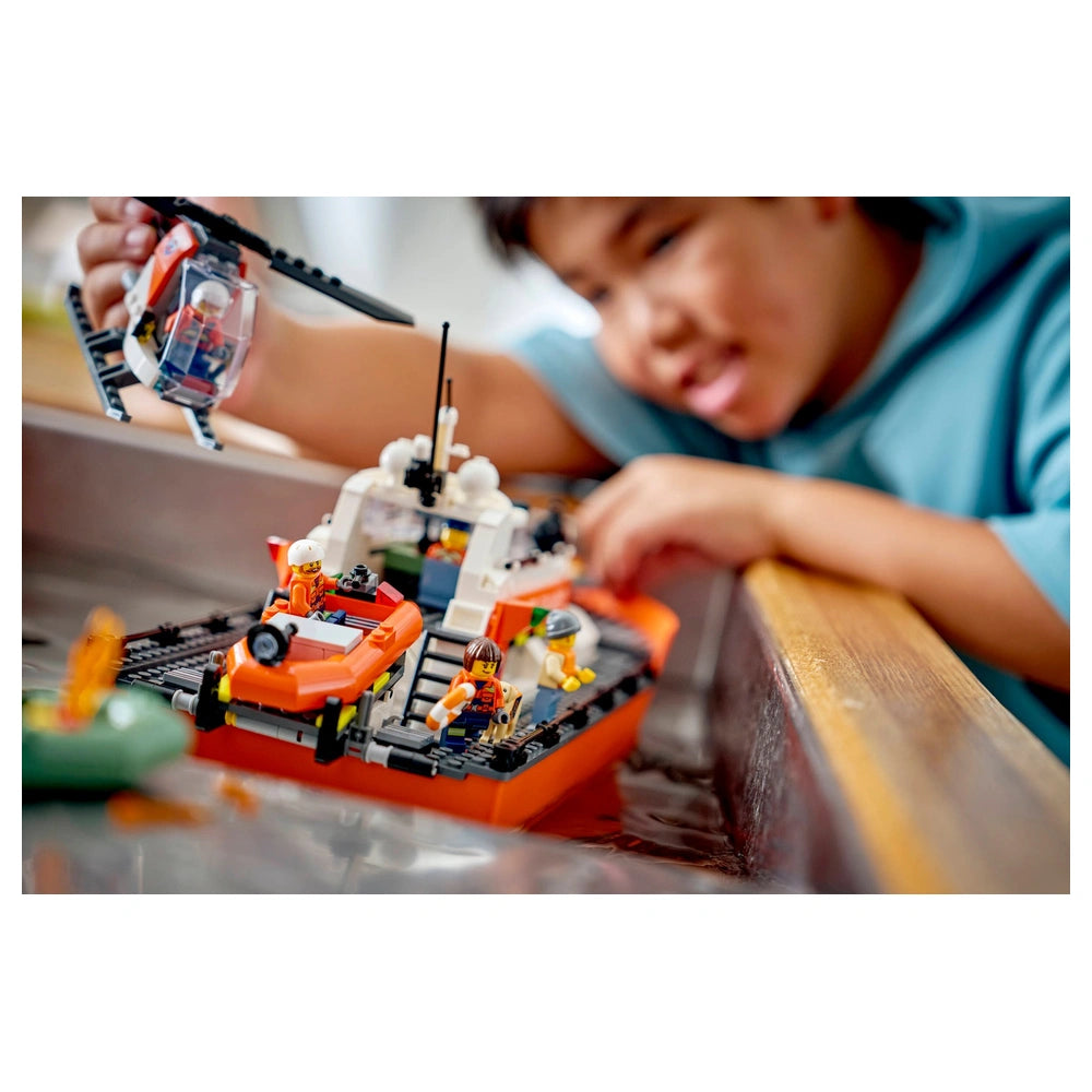 The LEGO® City Coast Guard Rescue Boat & Helicopter set includes a floating patrol boat, a rescue helicopter, and two additional dinghies, all of which are designed to float on water. The main boat features removable deck layers, allowing children to access various areas such as the control bridge, kitchen, and sleeping quarters. This thoughtful design encourages kids to engage in role-playing scenarios, enhancing their storytelling skills as they navigate through thrilling rescue operations.