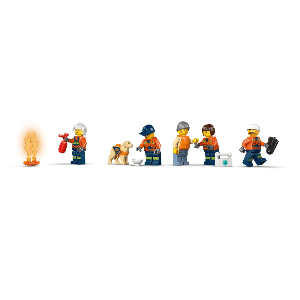 Included in this set are five minifigures and a dog figure, providing ample opportunity for interactive play. The minifigures come equipped with essential accessories, including a fire extinguisher, medic kit, life preserver, walkie-talkie, and dog bowl, ensuring that every rescue mission is well-prepared. Children can deploy the rescue dinghy from the launch ramp or take to the skies with the helicopter, creating endless possibilities for adventure.