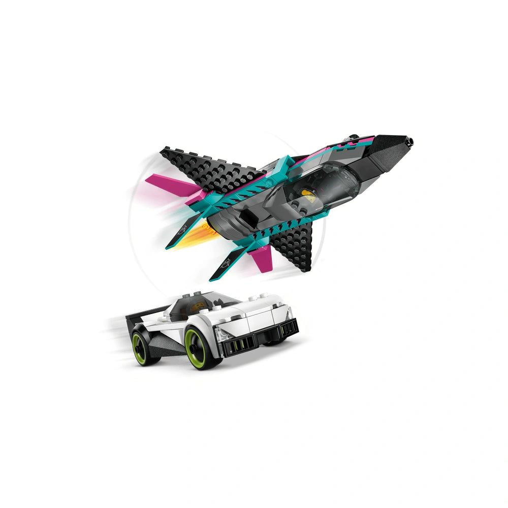 The LEGO City Jet vs. Car set is packed with realistic details that enhance the play experience. The jet boasts swept-back wings, twin vertical fins, and stabilizers, while the supercar features an accessible cockpit with a racing seat. Kids can engage the jet's afterburners by sliding a lever, adding an interactive element to their playtime. The inclusion of pilot and race driver minifigures allows for immersive storytelling as children create their own epic race scenarios.