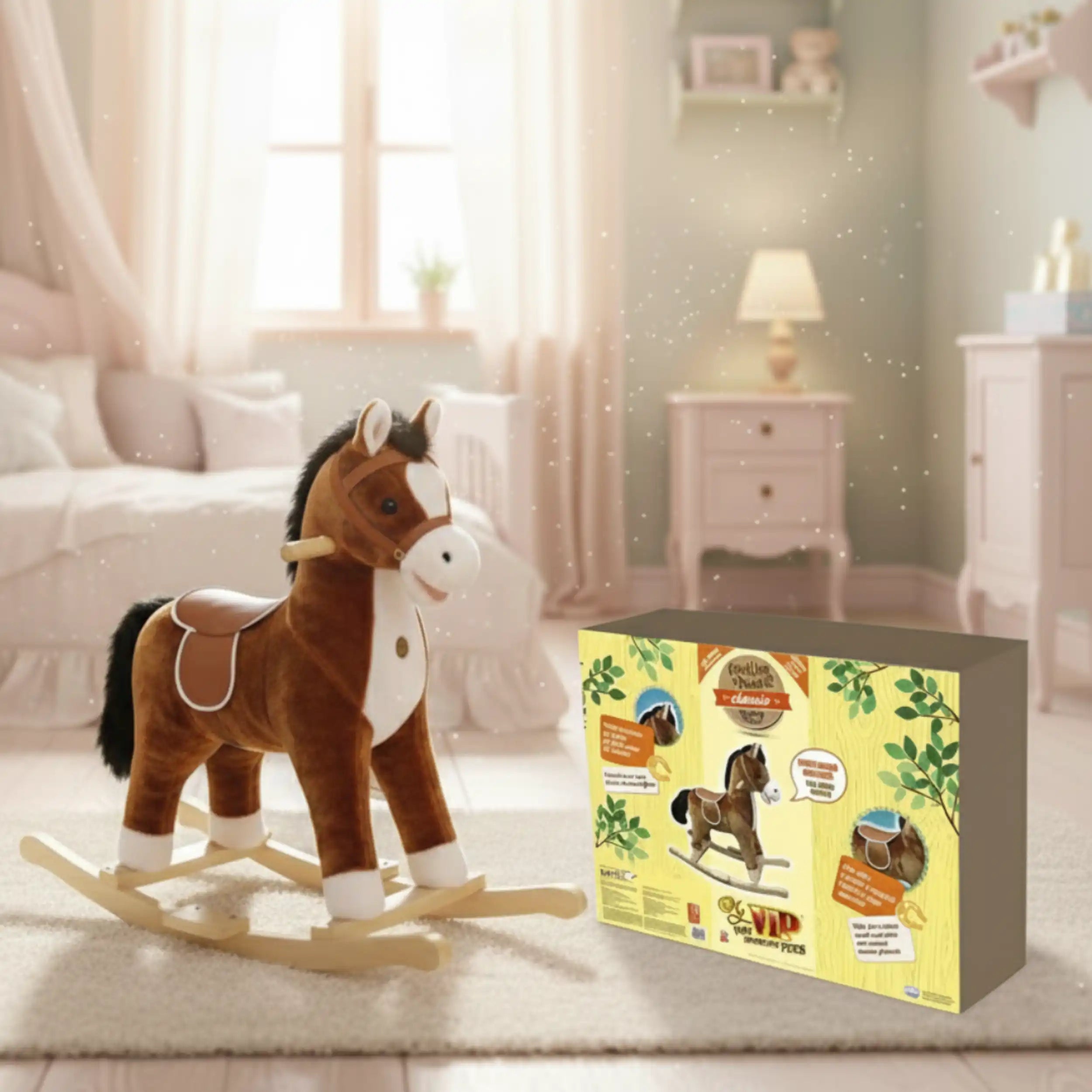 Introducing the My Vip Cavallo a Dondolo con Suoni, a delightful rocking horse designed to bring joy and excitement to children aged 12 months and up. Standing at a height of 65 cm, this charming toy combines the classic appeal of a rocking horse with modern features that enhance playtime. Crafted from durable wood and plush materials, it promises both safety and comfort for your little ones as they embark on imaginative adventures.