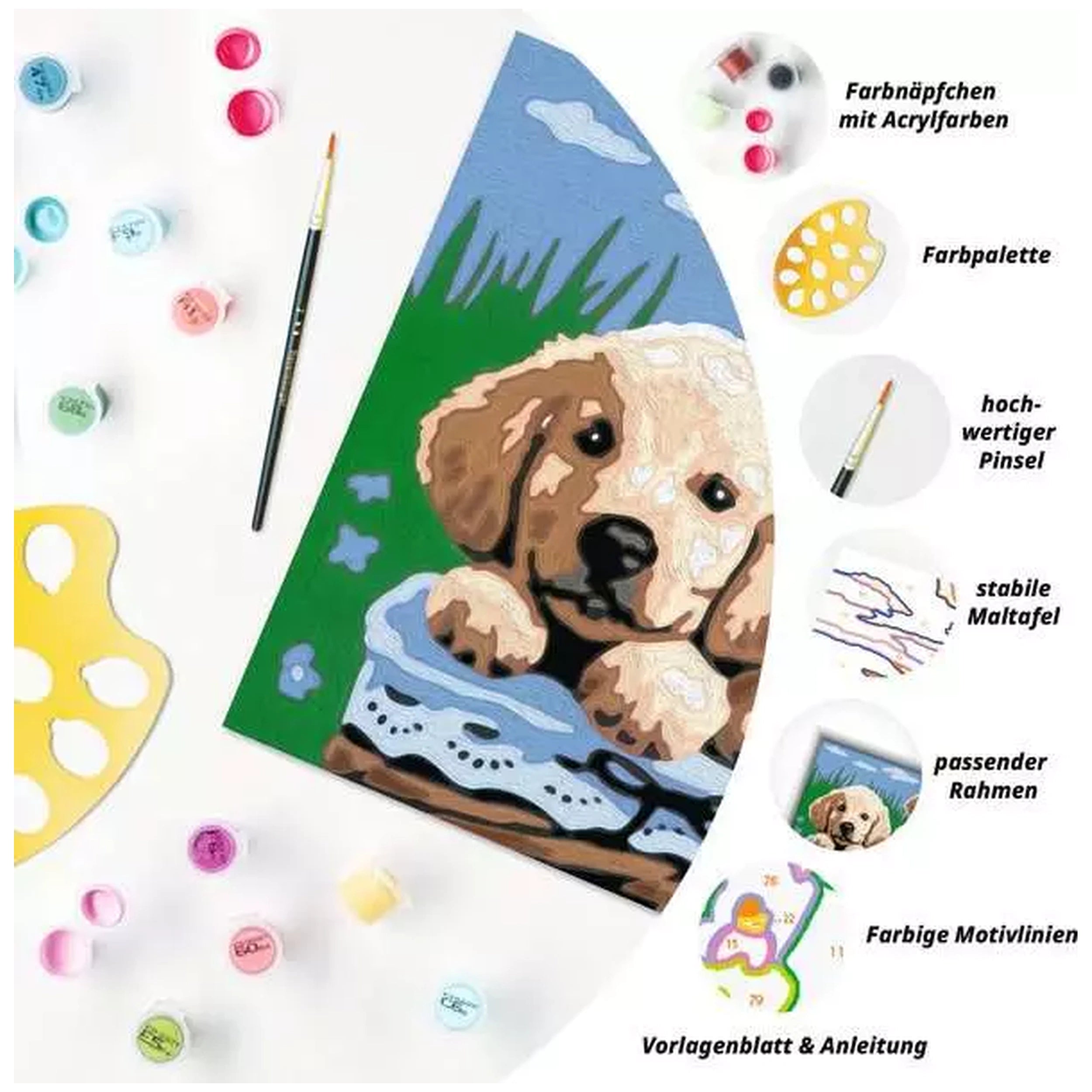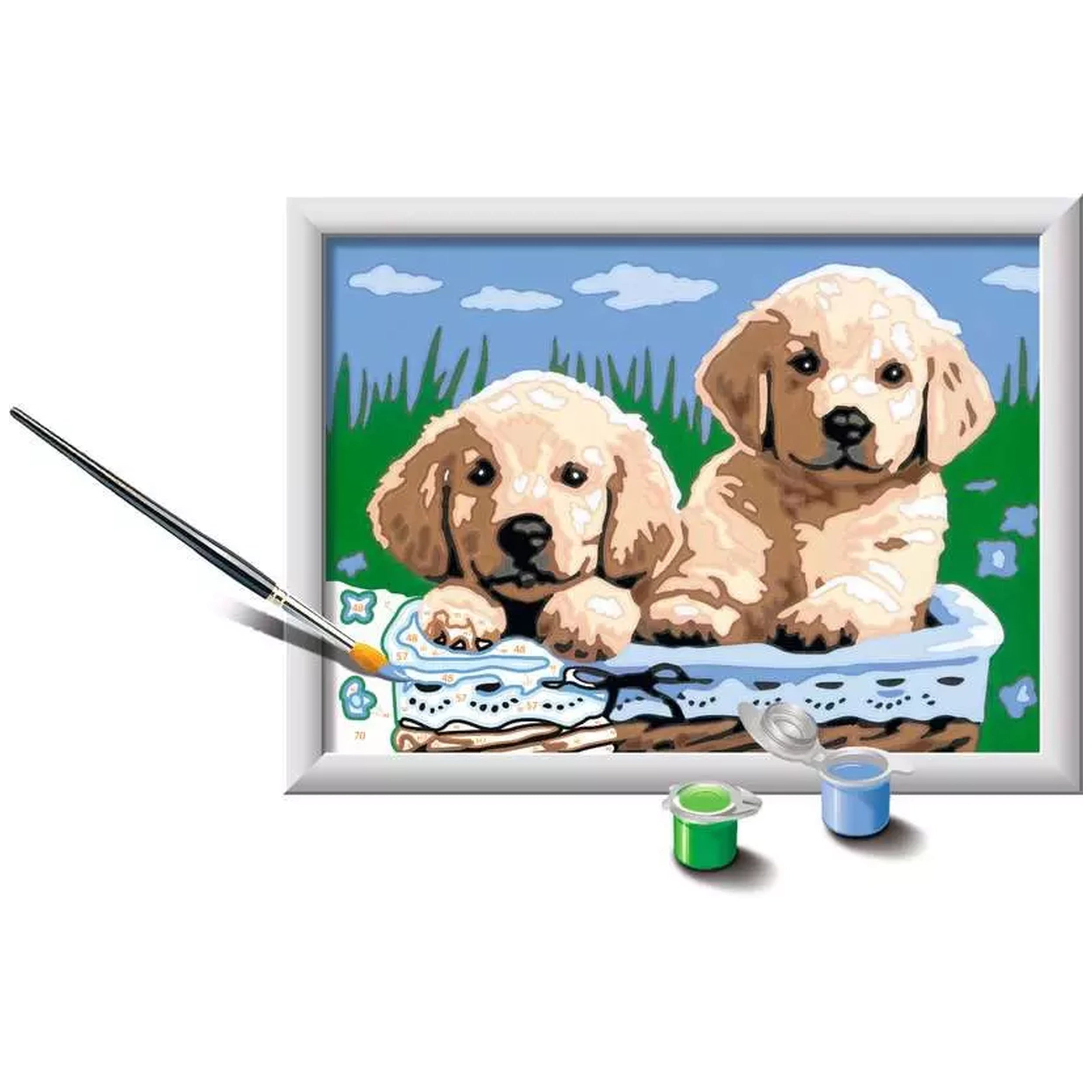 The Sweet Puppies painting set features vibrant colored outlines that guide young artists in recognizing the various elements of the design. This thoughtful feature not only enhances the painting experience but also ensures that children can easily identify the areas to color, making the process more enjoyable and less intimidating. The included brush is designed for optimal control, allowing for precise application of paint, which results in beautiful finished artwork that children can be proud of.