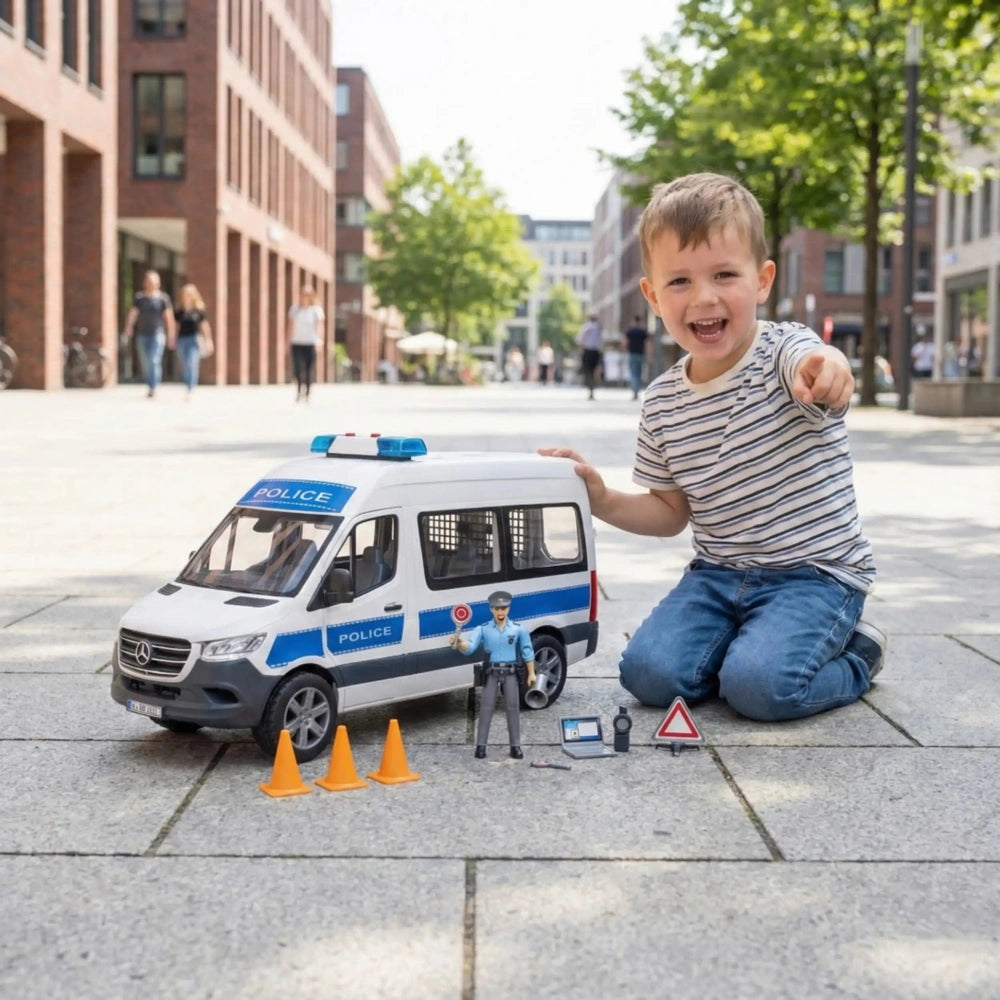 Bruder MB Sprinter police vehicle toy with officer, cones, laptop, and sign, featuring realistic details for imaginative play.