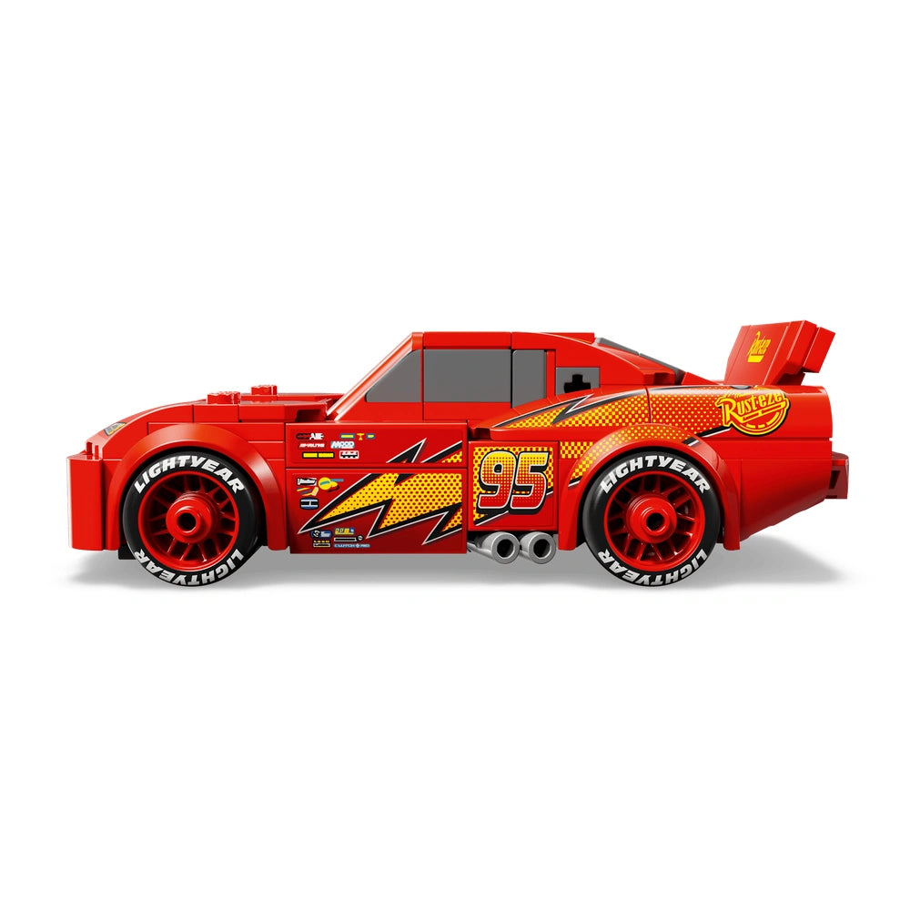 The LEGO® Speed Champions - Lightning McQueen set features a stunning replica of the famous race car, complete with his signature yellow and orange lightning bolt, the iconic number 95, and the Rust-Eze sponsor logo. Every detail has been meticulously crafted, including the imprinted Lightyear logo on the tires and the recognizable headlight stickers. This attention to detail not only enhances the play experience but also makes it a fantastic display piece once completed.