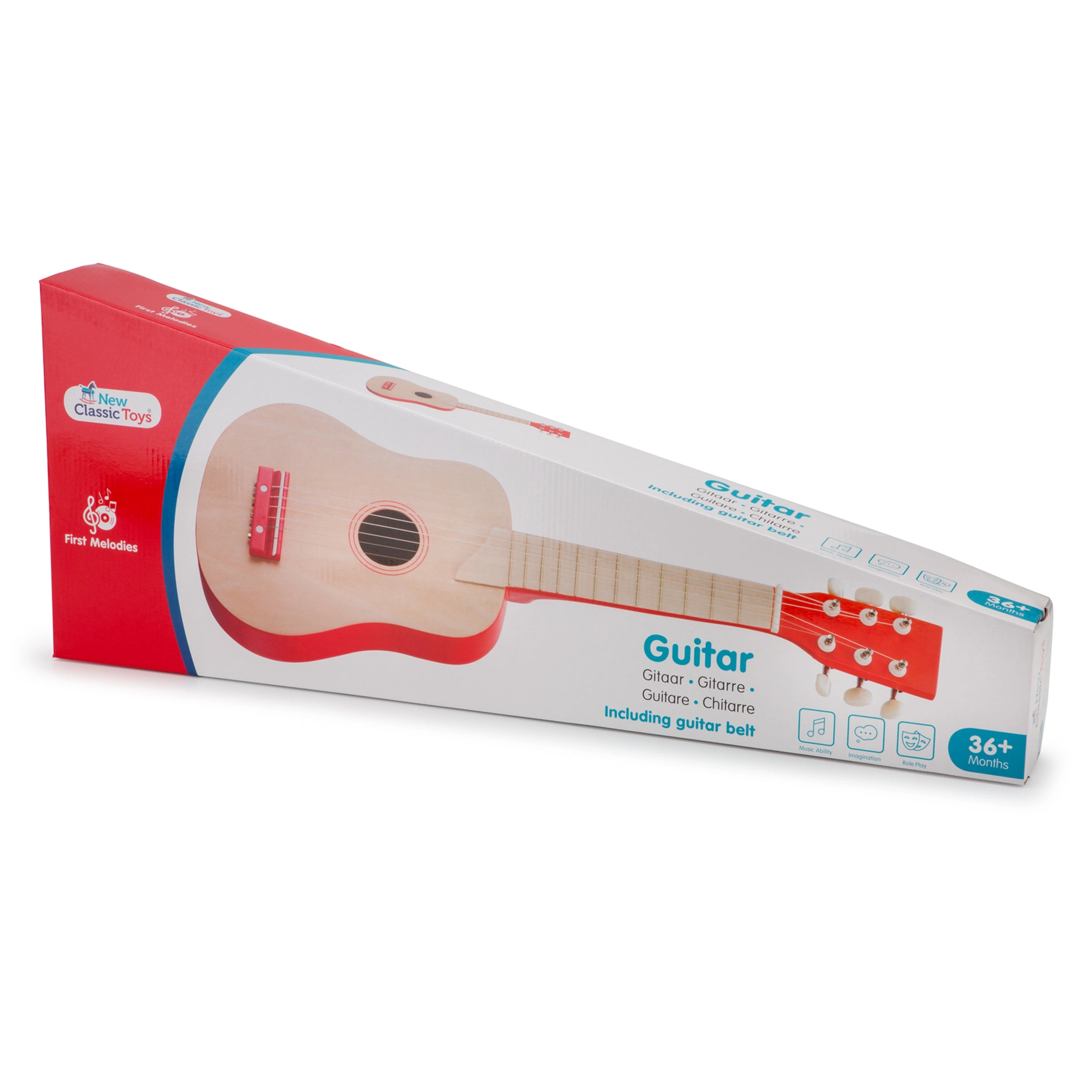 Introducing the New Classic Toys - Toy Guitar Deluxe in Natural/Red, a beautifully crafted wooden instrument designed to inspire creativity and musical exploration in children. This delightful toy guitar is not just a plaything; it serves as a gateway to the world of music, encouraging young minds to express themselves through sound and rhythm. With its vibrant colors and realistic design, this toy guitar is sure to capture your child's imagination and provide hours of entertainment.