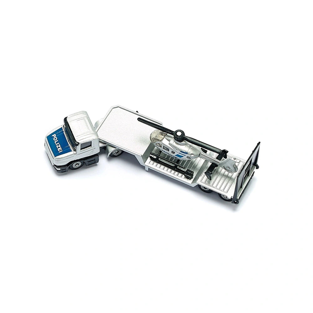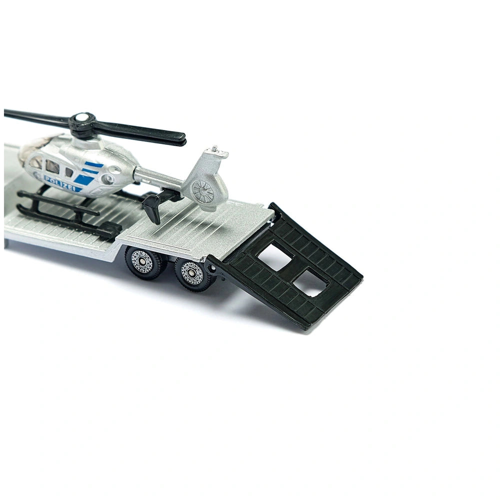 Introducing the Siku Low Loader with Helicopter, a remarkable addition to any child's playtime or collector's showcase. This meticulously crafted play vehicle set combines the durability of metal and plastic parts, ensuring longevity and resilience during play. Designed specifically to transport a SIKU police helicopter, this low loader is not just a toy; it’s an invitation to imaginative adventures and thrilling rescue missions.