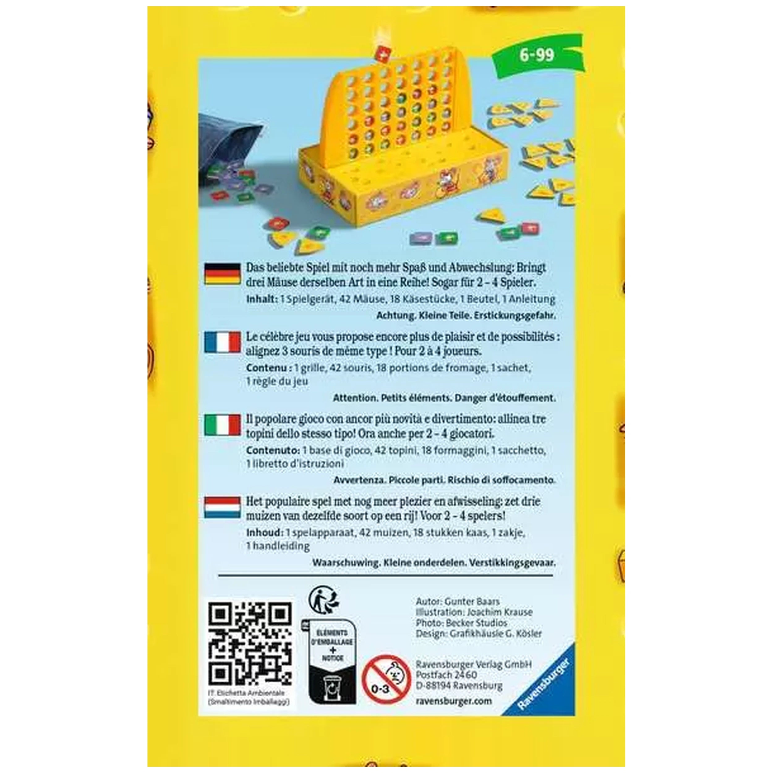 Introducing the Ravensburger - 3 Gewinnt! Board Game, a delightful and engaging experience that promises hours of fun for players of all ages. This captivating game combines strategy and luck as players take turns placing mice on a cheese grid, aiming to align three mice of the same type in a row. With its vibrant design and easy-to-understand mechanics, this game is perfect for family game nights, gatherings with friends, or even as an educational tool for young learners.
