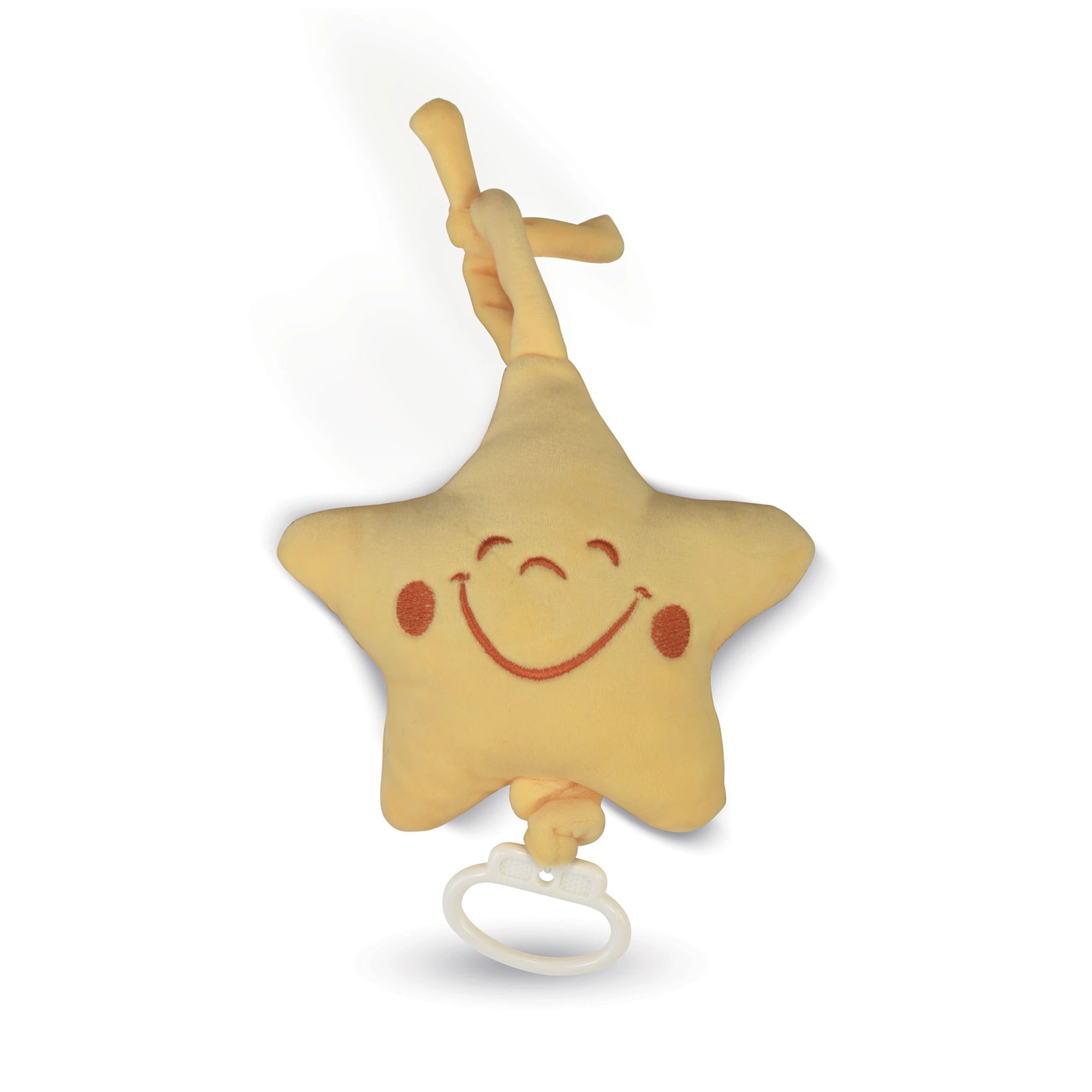 The Stella Carillon measures 16 cm in height and features a soft, plush yellow body shaped like a star. Its cheerful embroidered face, complete with a happy smile and rosy cheeks, is designed to captivate your baby's attention. The toy is lightweight and perfectly sized for tiny hands to grasp, encouraging your baby to explore and interact with their environment. A sturdy plastic ring at the bottom ensures that it is safe for your baby to hold or mouth, while a soft fabric loop at the top allows for easy attachment to cribs, strollers, car seats, or playmats.