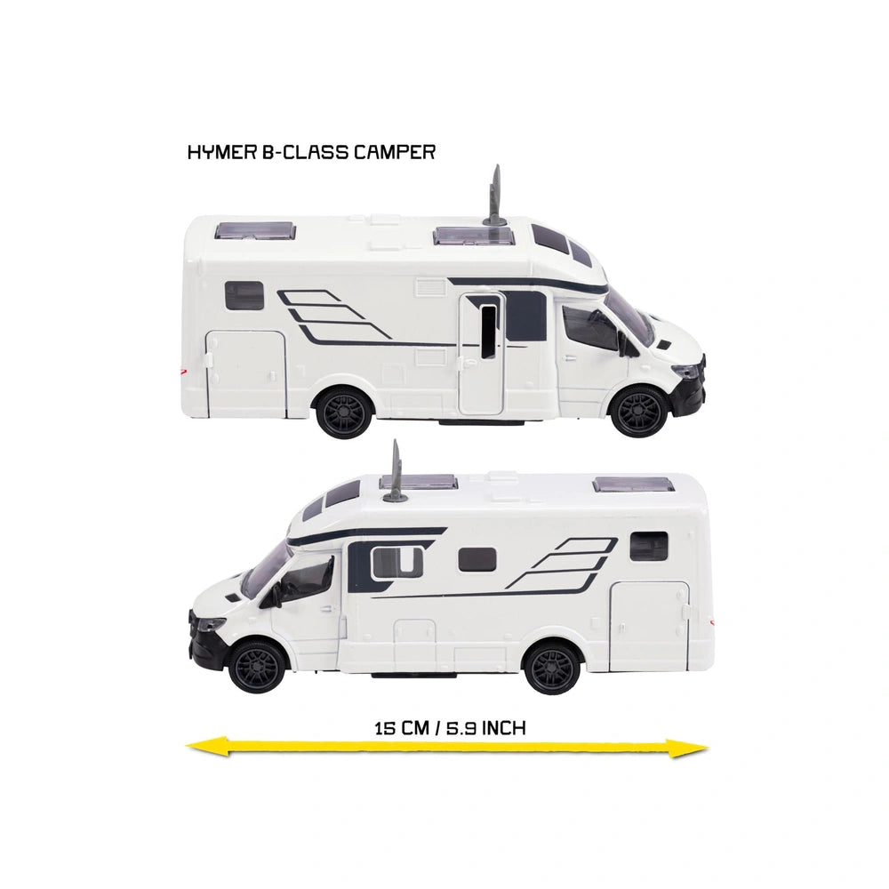 The Majorette Hymer B-Class Camper, measuring 19 cm, features a robust metal body complemented by intricate details that mirror its real-life counterpart. With an officially licensed Mercedes-Benz driver's cab and HYMER bodywork, this model stands out for its authenticity and craftsmanship. Children can engage in imaginative play by opening the right front door and two storage compartments, perfect for loading camping gear and reenacting adventures. The movable satellite dish adds an interactive element, enhancing the play experience.