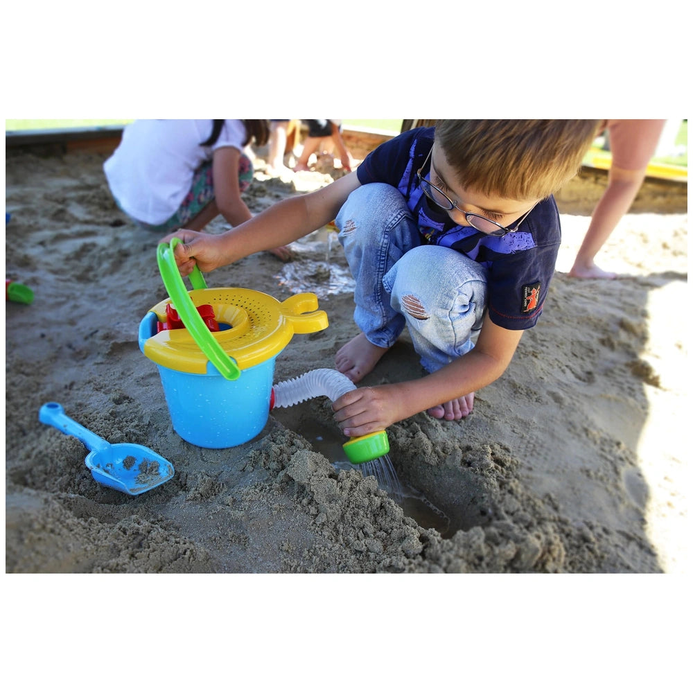 One of the standout features of the Gowi Hose Bucket is its removable sieve, which is equipped with a built-in water wheel. This innovative design allows children to fill the bucket with water, watch it flow through the sieve, and then pour it out again using the attached hose and showerhead. This interactive element not only enhances the play experience but also introduces basic concepts of physics and water flow, making it an educational tool as well as a toy.