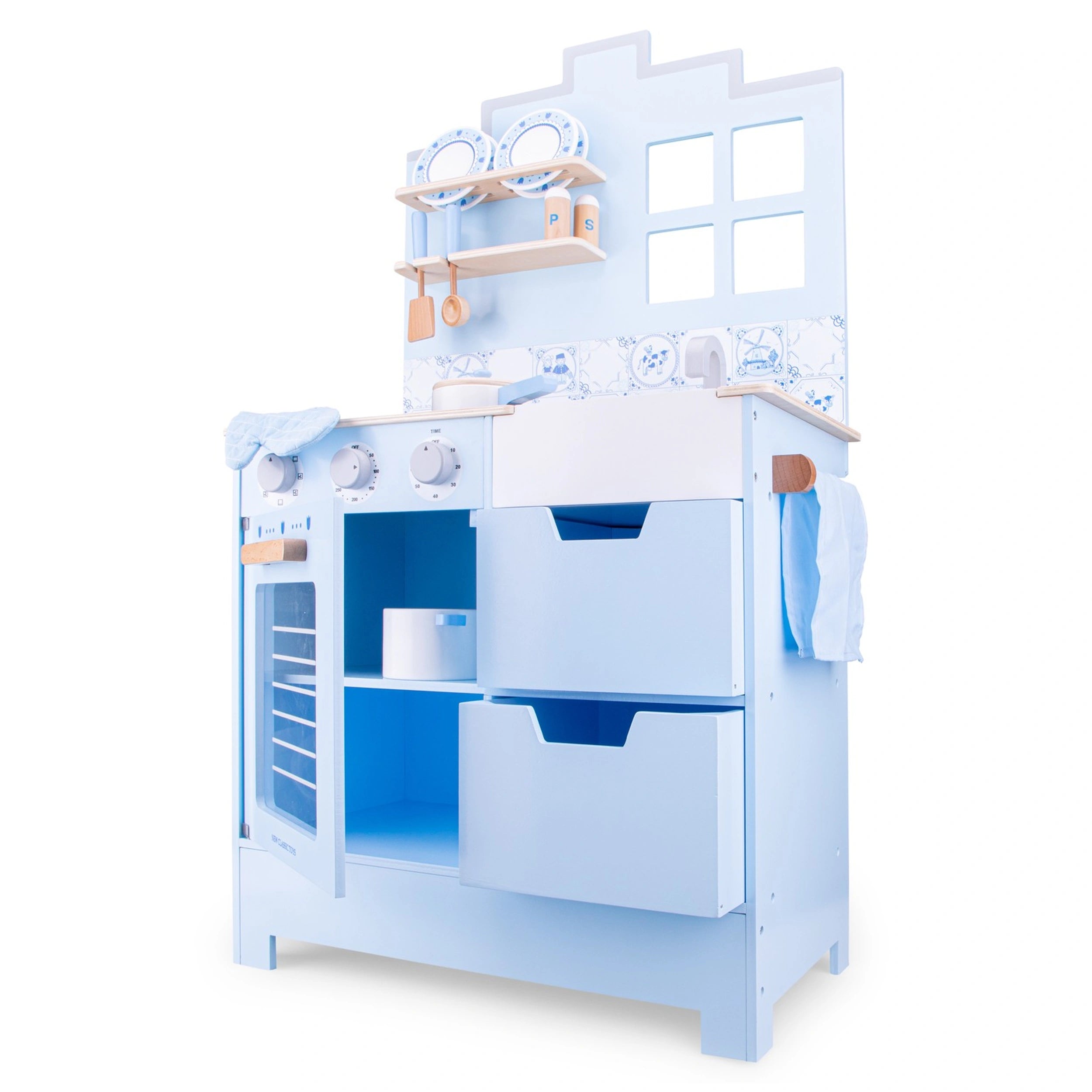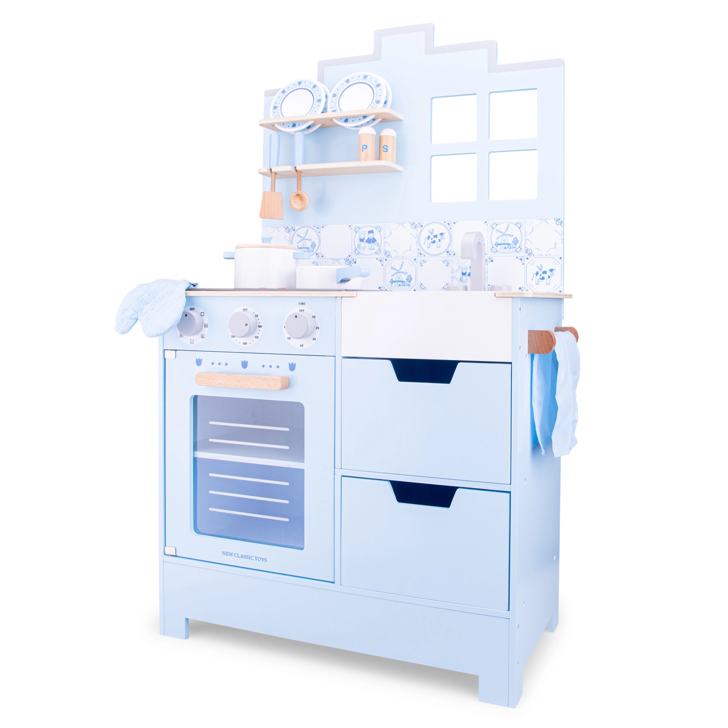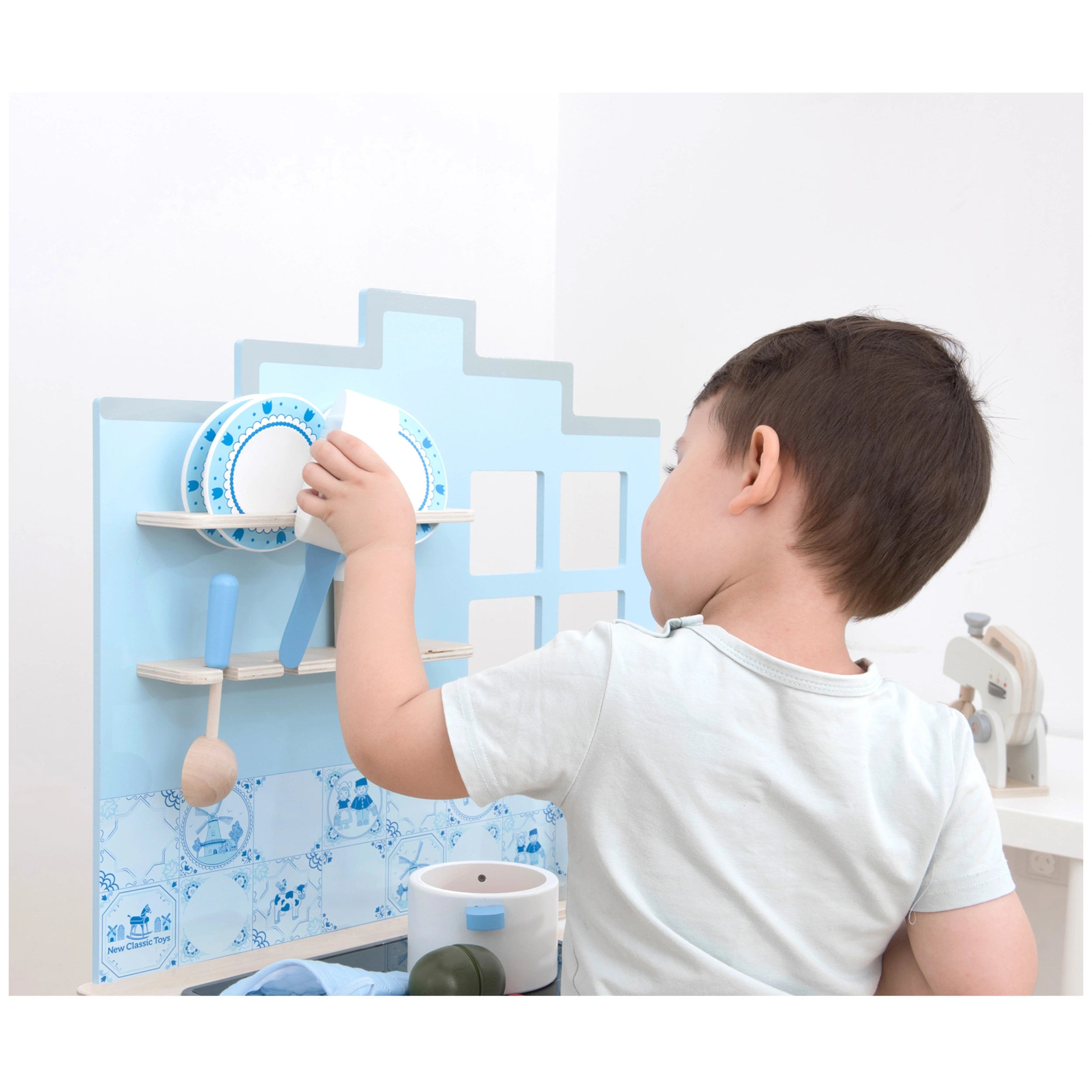 Introducing the New Classic Toys Kitchenette in Delft Blue, a stunning addition to any child's playroom that inspires creativity and imaginative role-playing. This beautifully crafted wooden kitchen is designed to provide endless hours of fun while encouraging children to explore the world of cooking. With its elegant Delft Blue finish, this kitchenette not only serves as a playset but also as a charming decorative piece in your home.