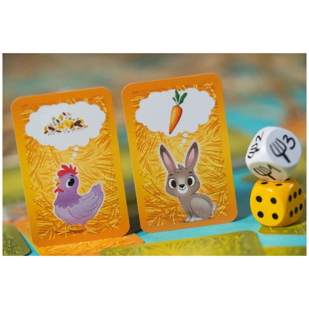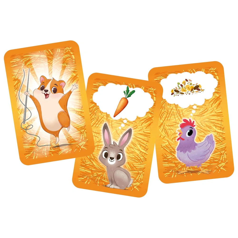 The charming characters, including Harry Hamster, the hungry rabbit, and the playful mouse, are beautifully illustrated in a vibrant, cartoon style that captivates players of all ages. Each card features these adorable critters alongside their preferred treats, creating a visually stimulating experience that enhances the overall enjoyment of the game. The whimsical theme of a chaotic hay pile adds an element of silliness, making it an entertaining choice for both children and adults alike.
