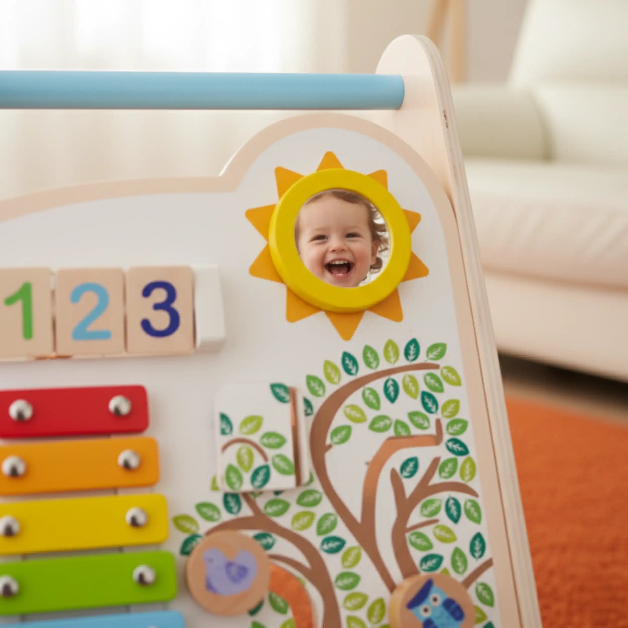 The Activity Walker measures 32 x 32 x 49 centimeters, making it the ideal size for toddlers who are beginning to walk. Its sturdy construction ensures safety and stability, allowing your child to confidently navigate their environment. The walker features an array of interactive toys that encourage imaginative play, helping to develop fine motor skills and hand-eye coordination. From colorful beads to spinning elements, each component is designed to captivate your child's attention and promote cognitive development.