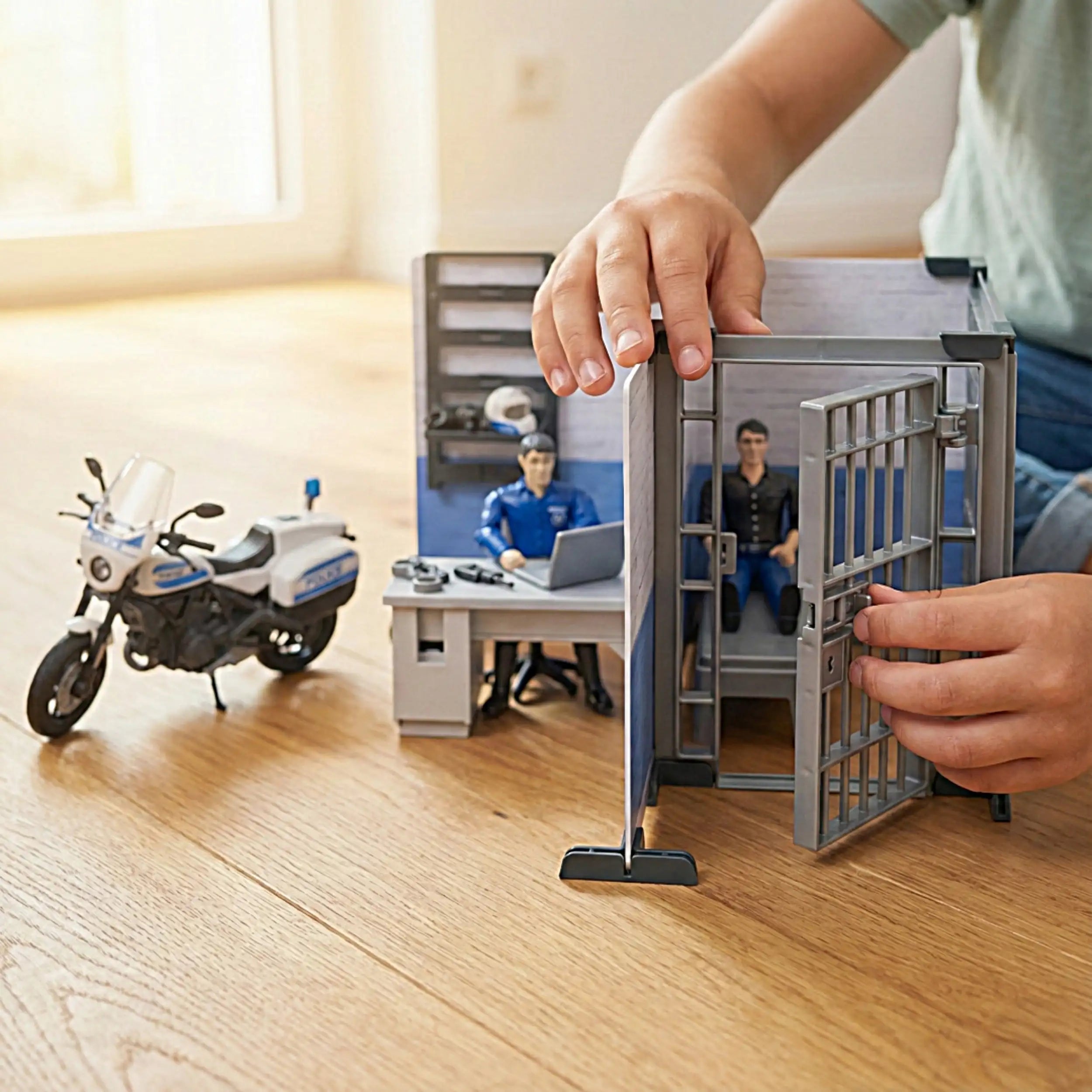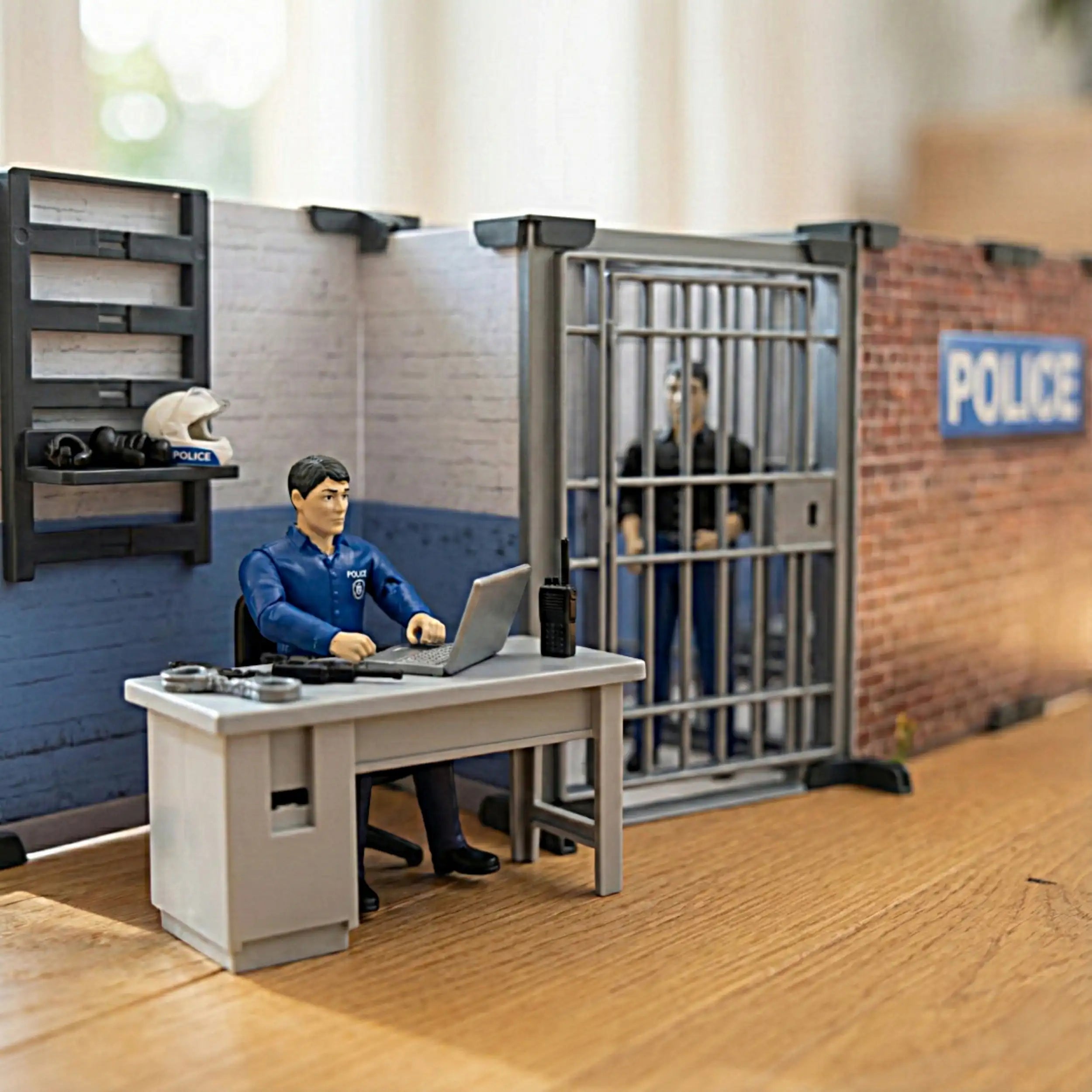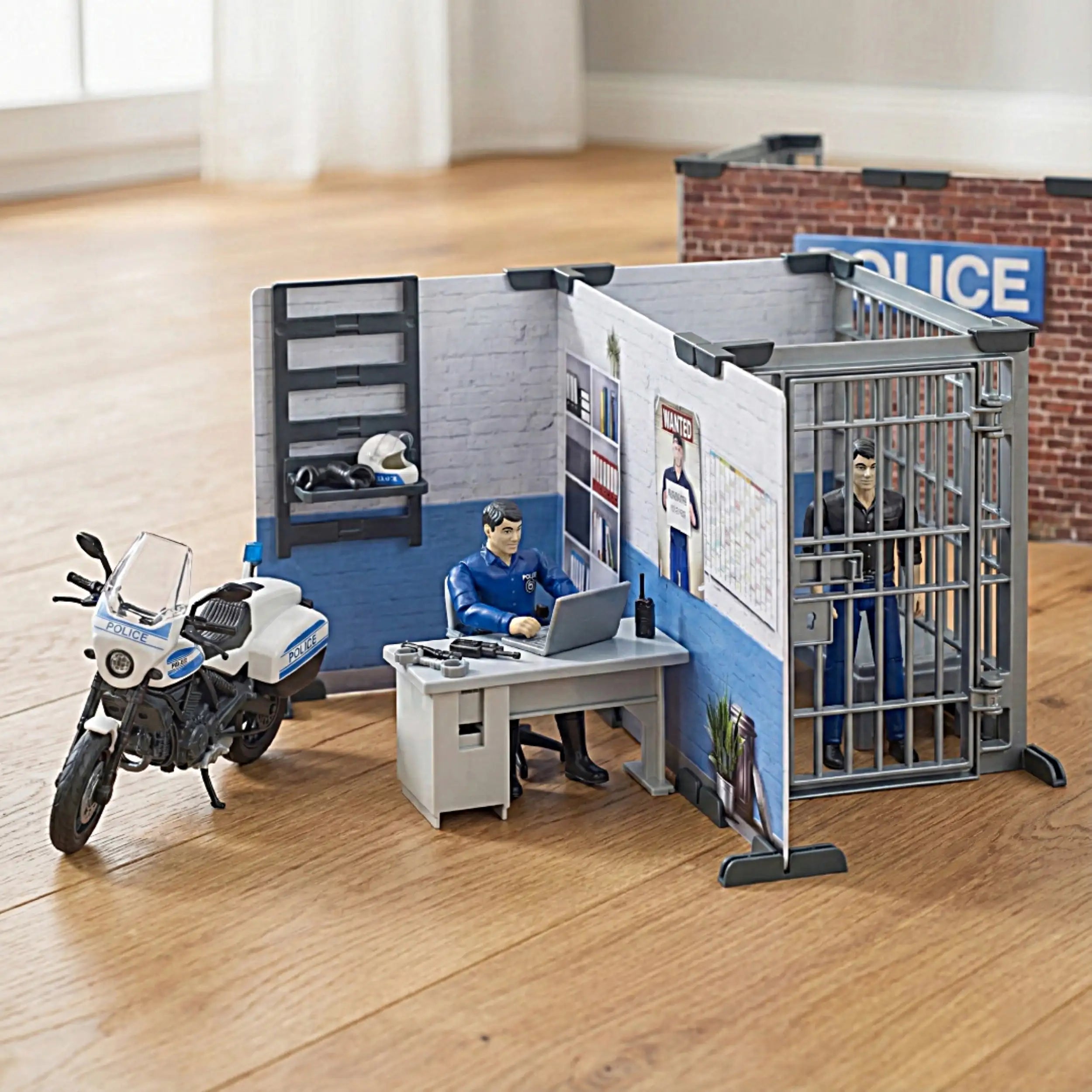 Police station playset with officer figure, motorcycle, and suspect; features desk, chair, and jail cell in a realistic setup.