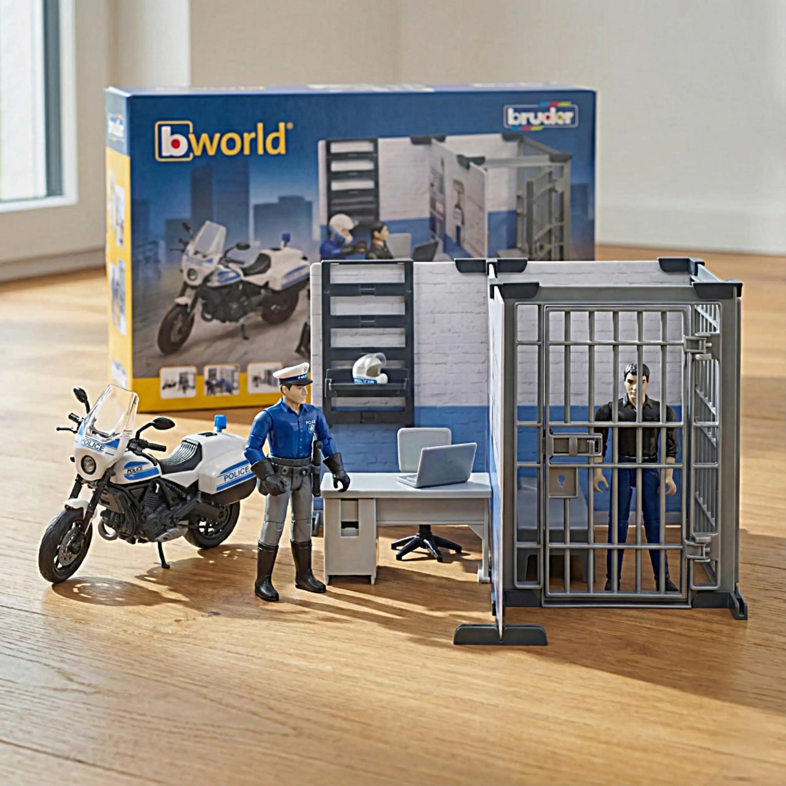 Bruder police station playset with motorcycle, officer at desk, figure in jail cell, detailed accessories included.