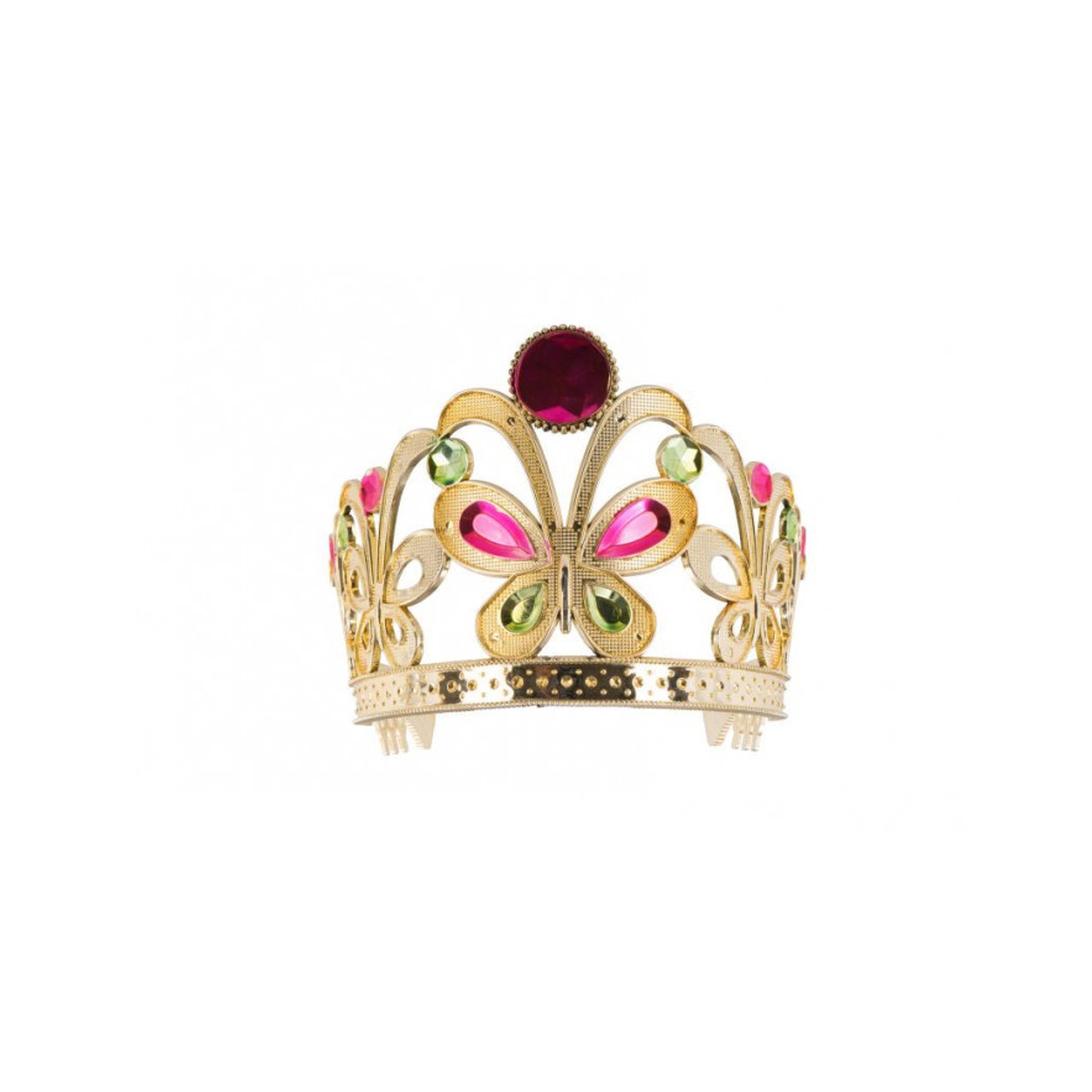 Introducing the Carnival Toys Gold Crown with Butterfly Colored Gems for Girls, a stunning accessory designed to elevate any costume or imaginative play. This exquisite crown features a radiant gold finish adorned with vibrant butterfly-shaped gems, making it a perfect addition to a princess outfit for Carnival celebrations or any festive occasion. Crafted with care, this crown is not only visually appealing but also lightweight and comfortable for young wearers.