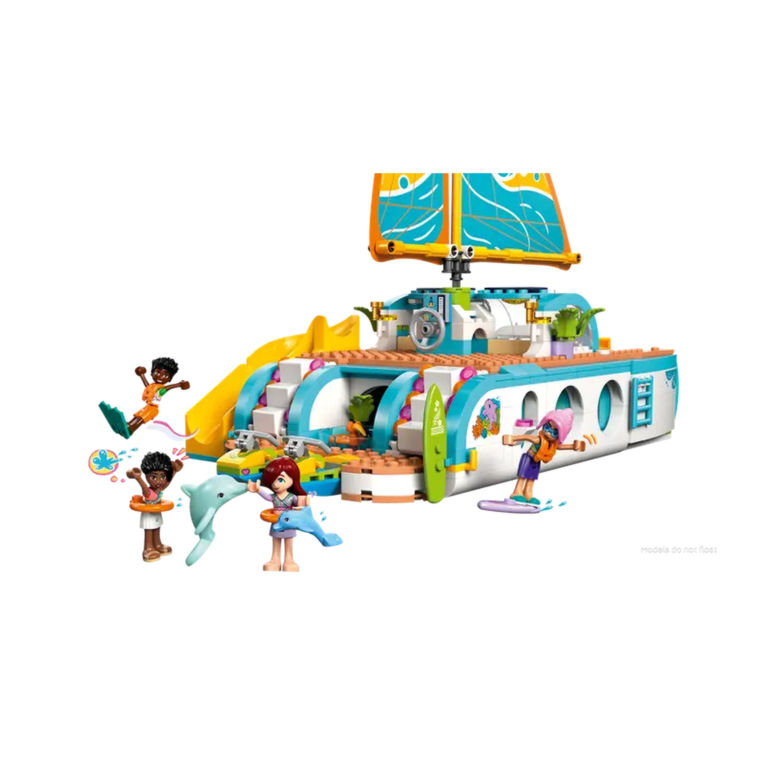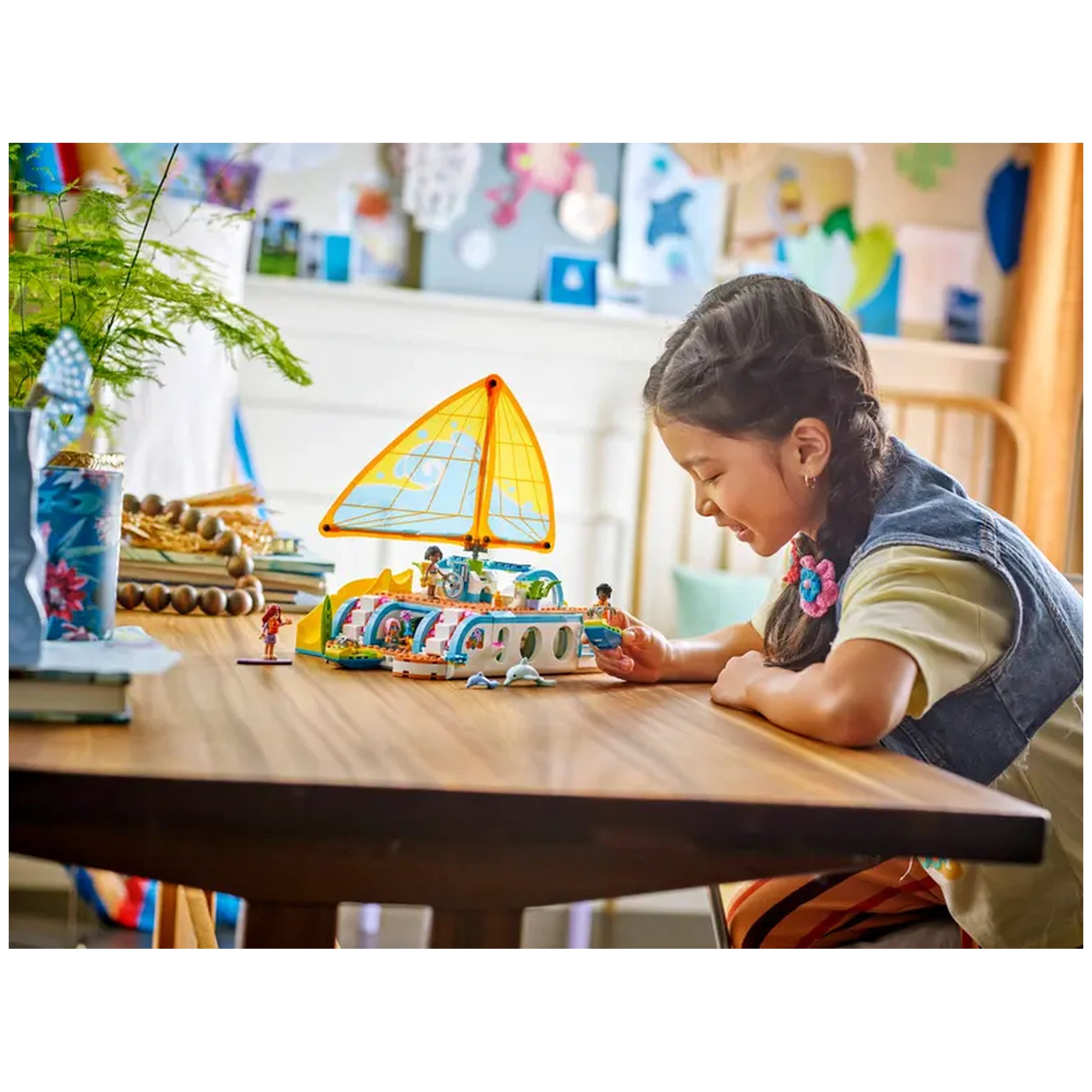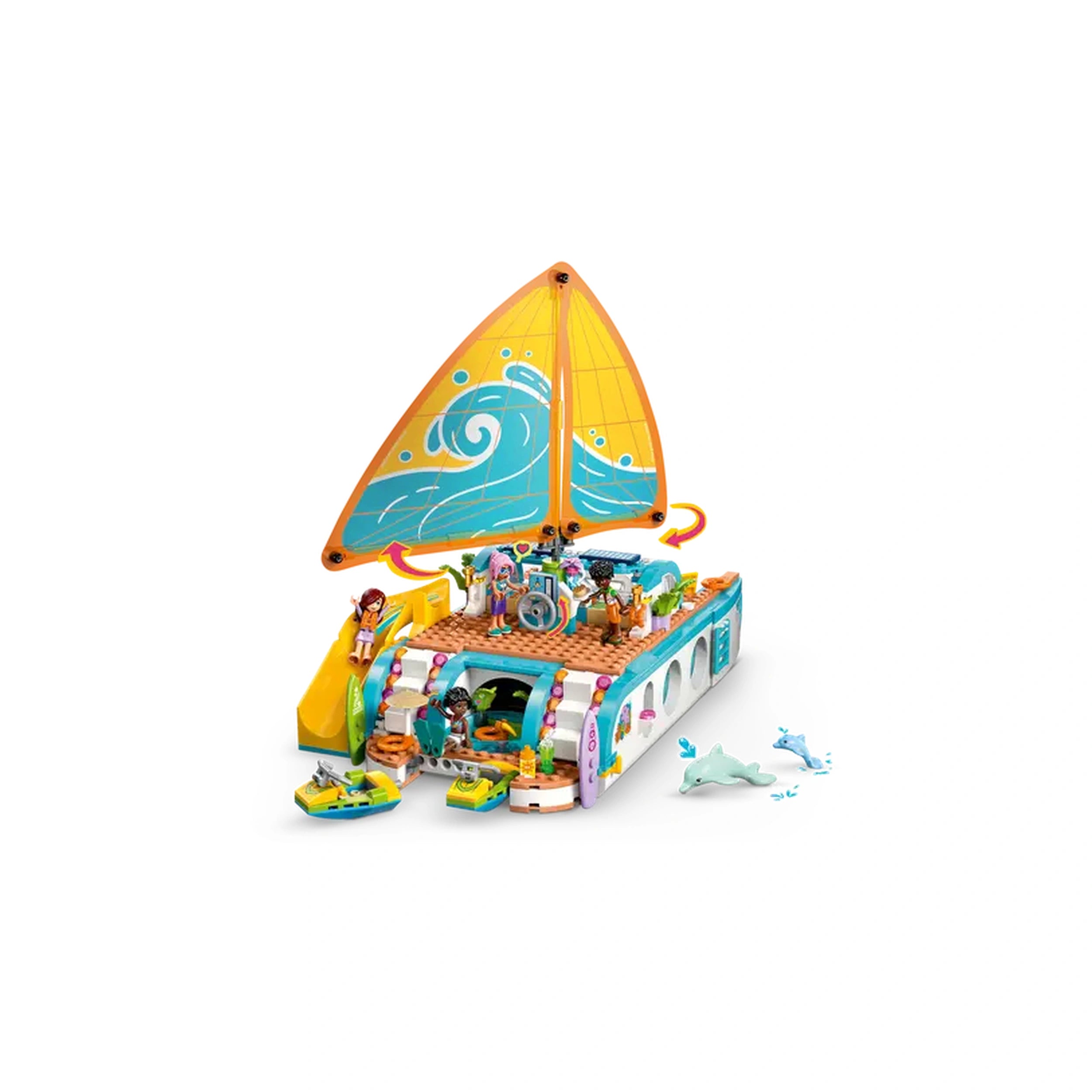 The Travel Boat Adventure set features four LEGO Friends minidolls—Paisley, Zac, Celine, and Sky—along with two adorable dolphin figures. Each character brings their unique personality to life, encouraging children to create their own narratives as they navigate the open waters. The boat itself is a marvel of design, equipped with realistic features such as a functioning sail that moves when the wheel is turned, allowing for an immersive play experience that mimics real sailing adventures.