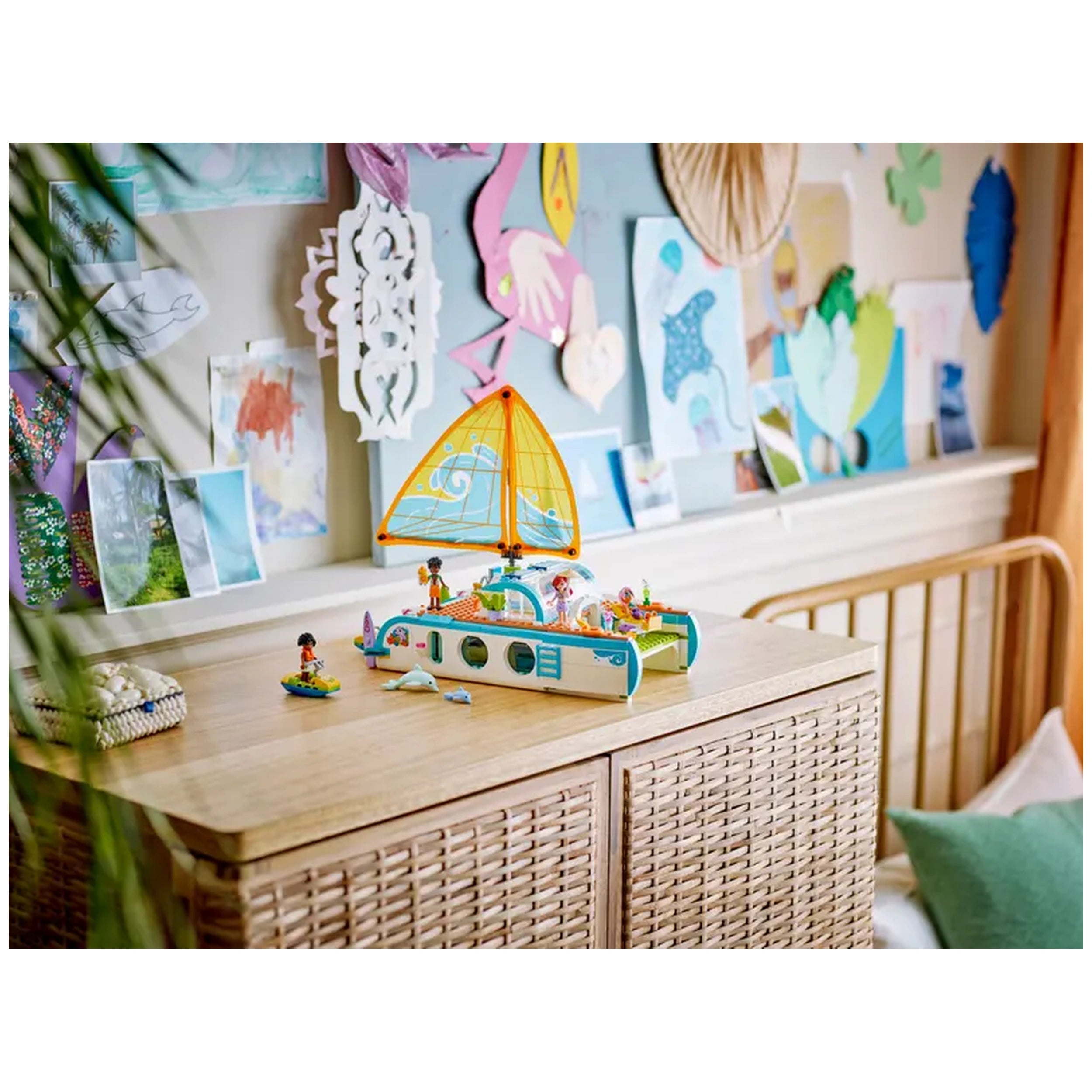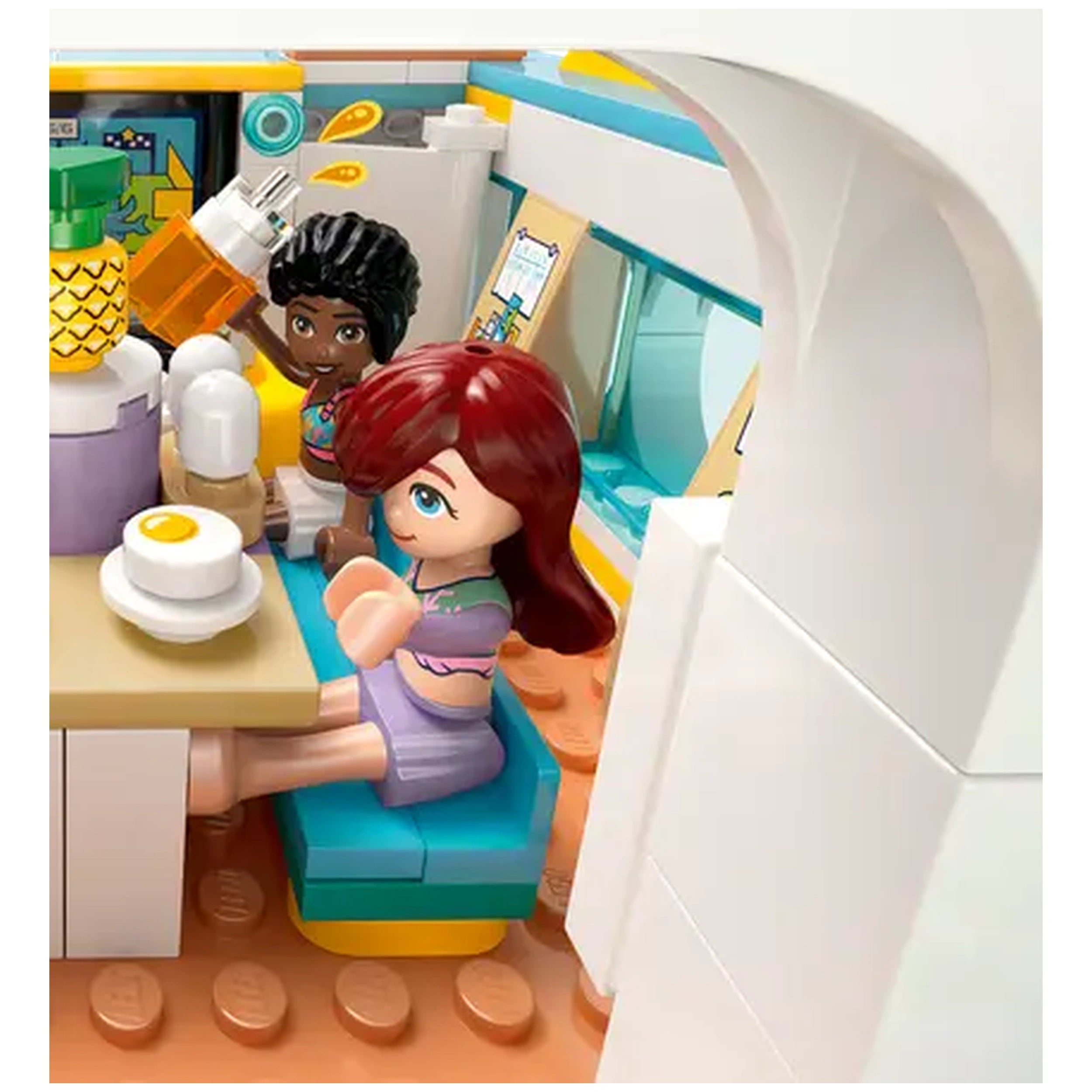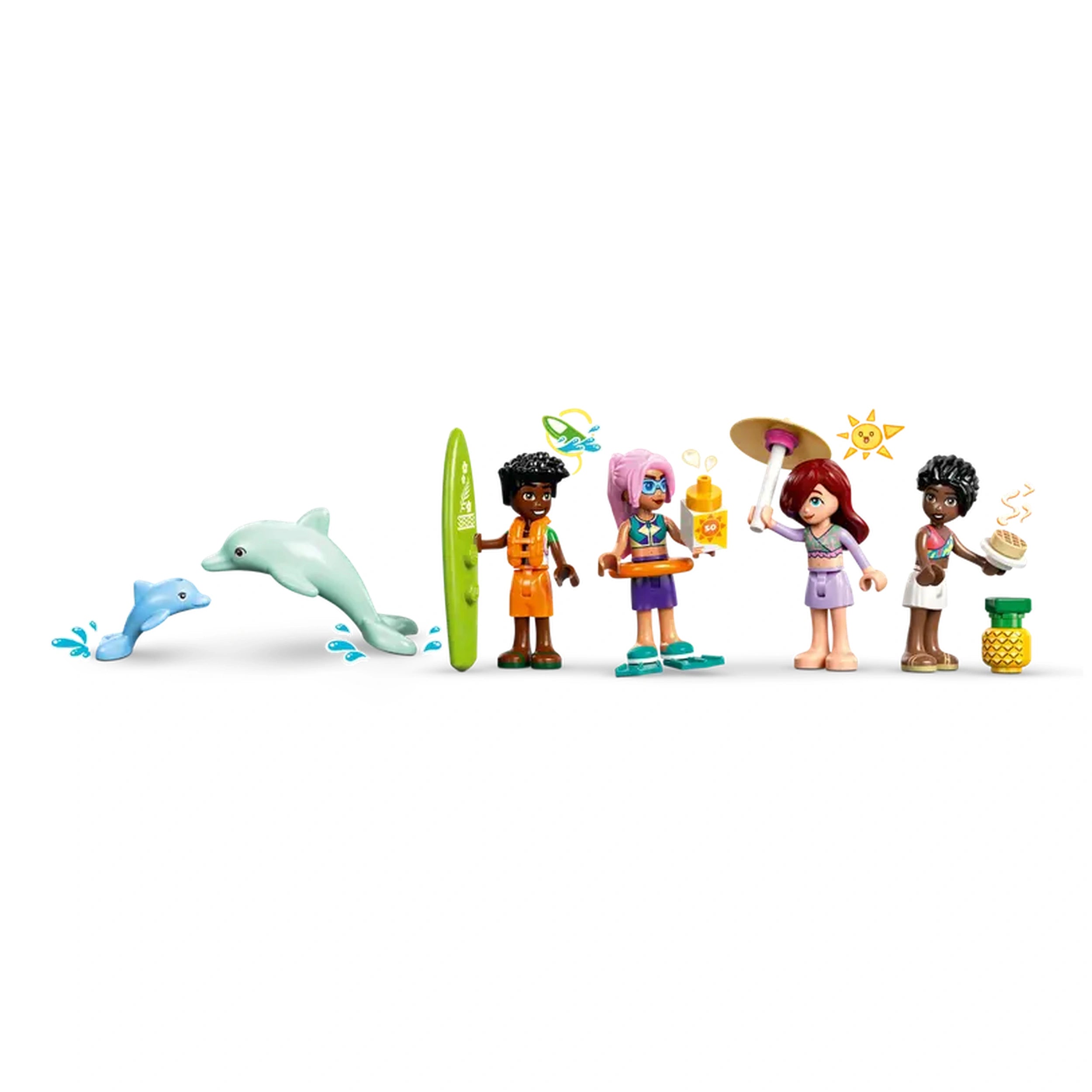 The Travel Boat Adventure set features four LEGO Friends minidolls—Paisley, Zac, Celine, and Sky—along with two adorable dolphin figures. Each character brings their unique personality to life, encouraging children to create their own narratives as they navigate the open waters. The boat itself is a marvel of design, equipped with realistic features such as a functioning sail that moves when the wheel is turned, allowing for an immersive play experience that mimics real sailing adventures.
