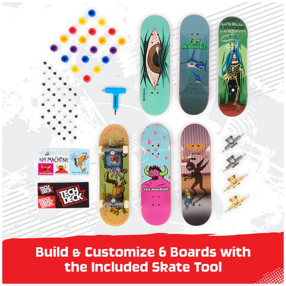 The Tech Deck Sk8shop Bonus Pack includes six unique fingerboard decks, each featuring authentic designs that reflect the vibrant world of skateboarding. This assortment allows users to build and customize three complete mini skateboards, providing everything needed to create a personalized setup. Included in the pack are extra boards, wheels, stickers, and a skate tool, ensuring that every fingerboarder can express their individuality and style.